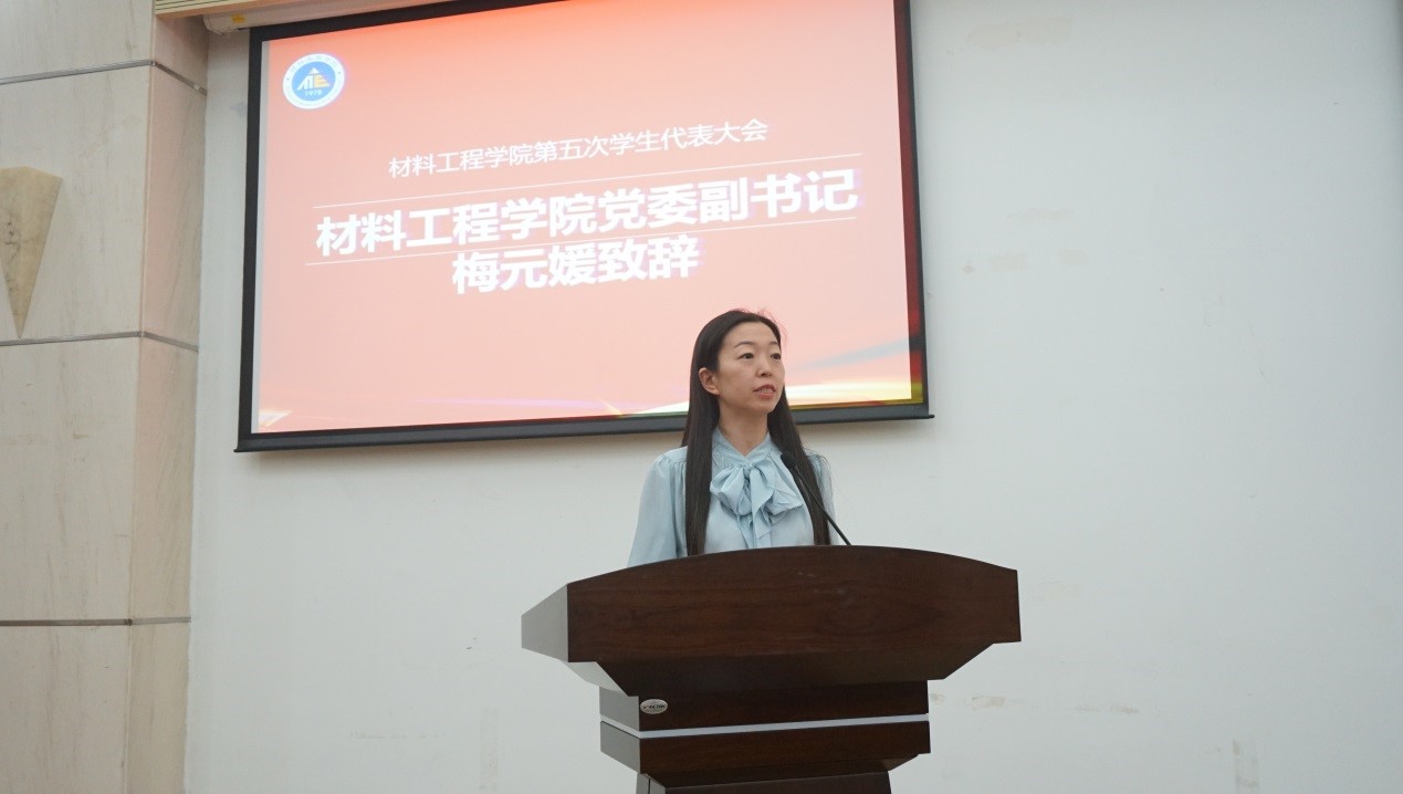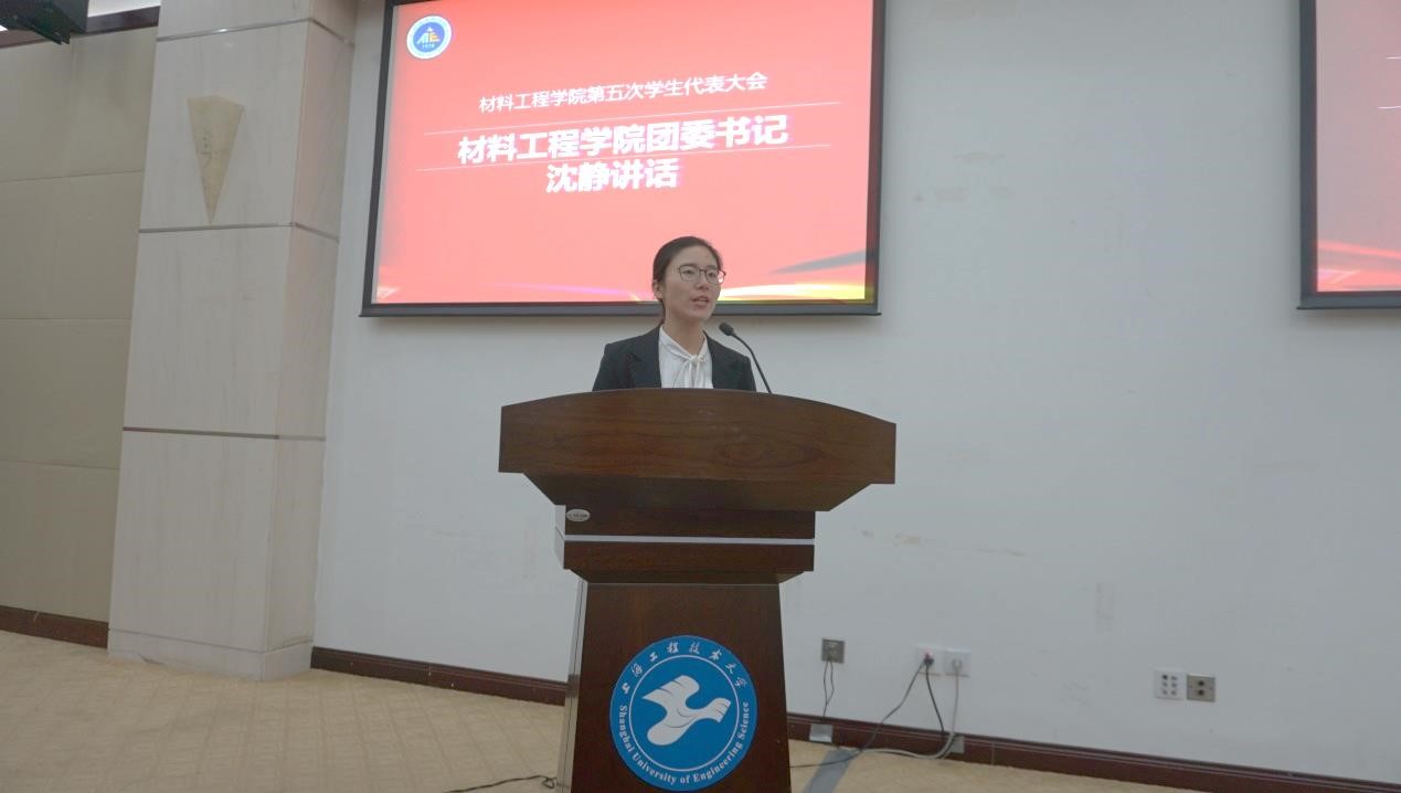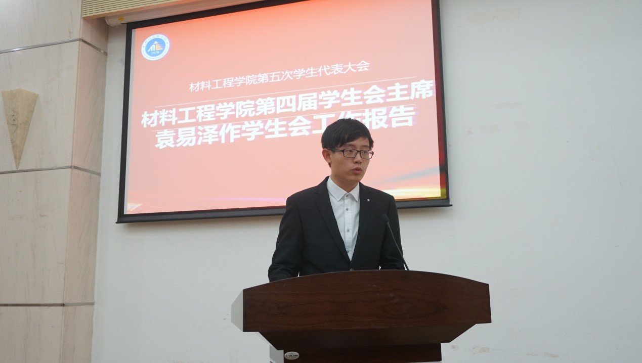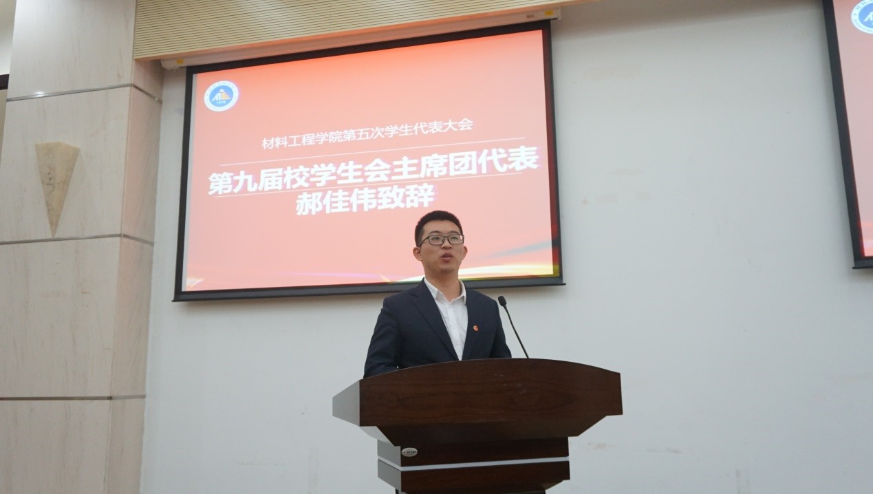 上海工程技术大学第九届学生会副主席郝佳伟代表校学生会致辞。材料工程学院第四届学生会主席袁易泽做了题为《勇立时代潮头 激扬奋斗梦想——团结带领广大学生贡献青春力量》的工作报告。