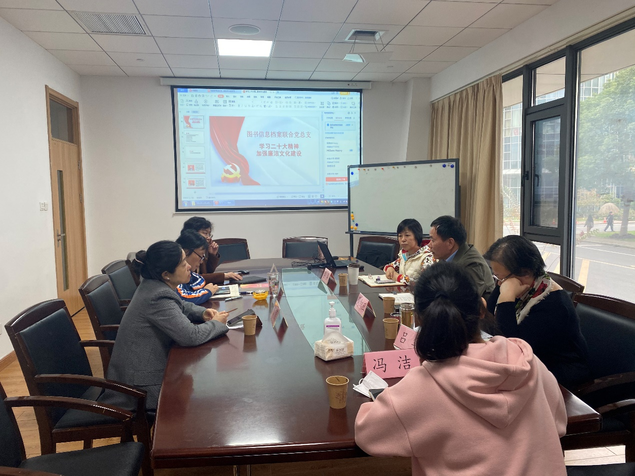 11月24日,图书信息档案联合党总支在第二图文中心103会议室召开中心组学习会,以“党的二十大精神,加强廉洁文化建设”为题,深入学习贯彻党的二十大精神。党总支中心组成员参加会议,宣传部新闻办常务副主任冯洁列席会议。会议由党总支书记李军主持。