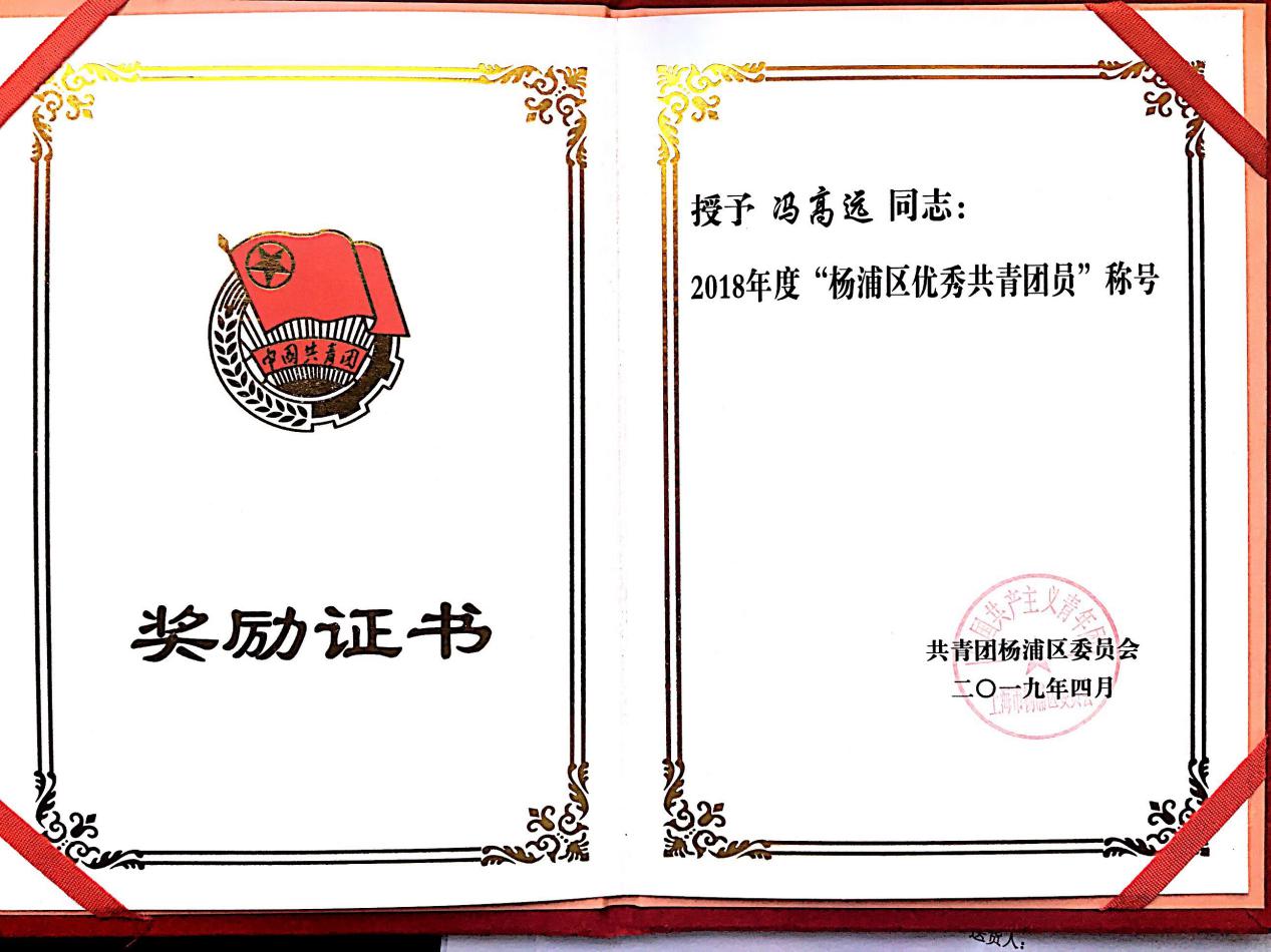 冯高远获得2018 年度“杨浦区优秀共青团员”荣誉证书