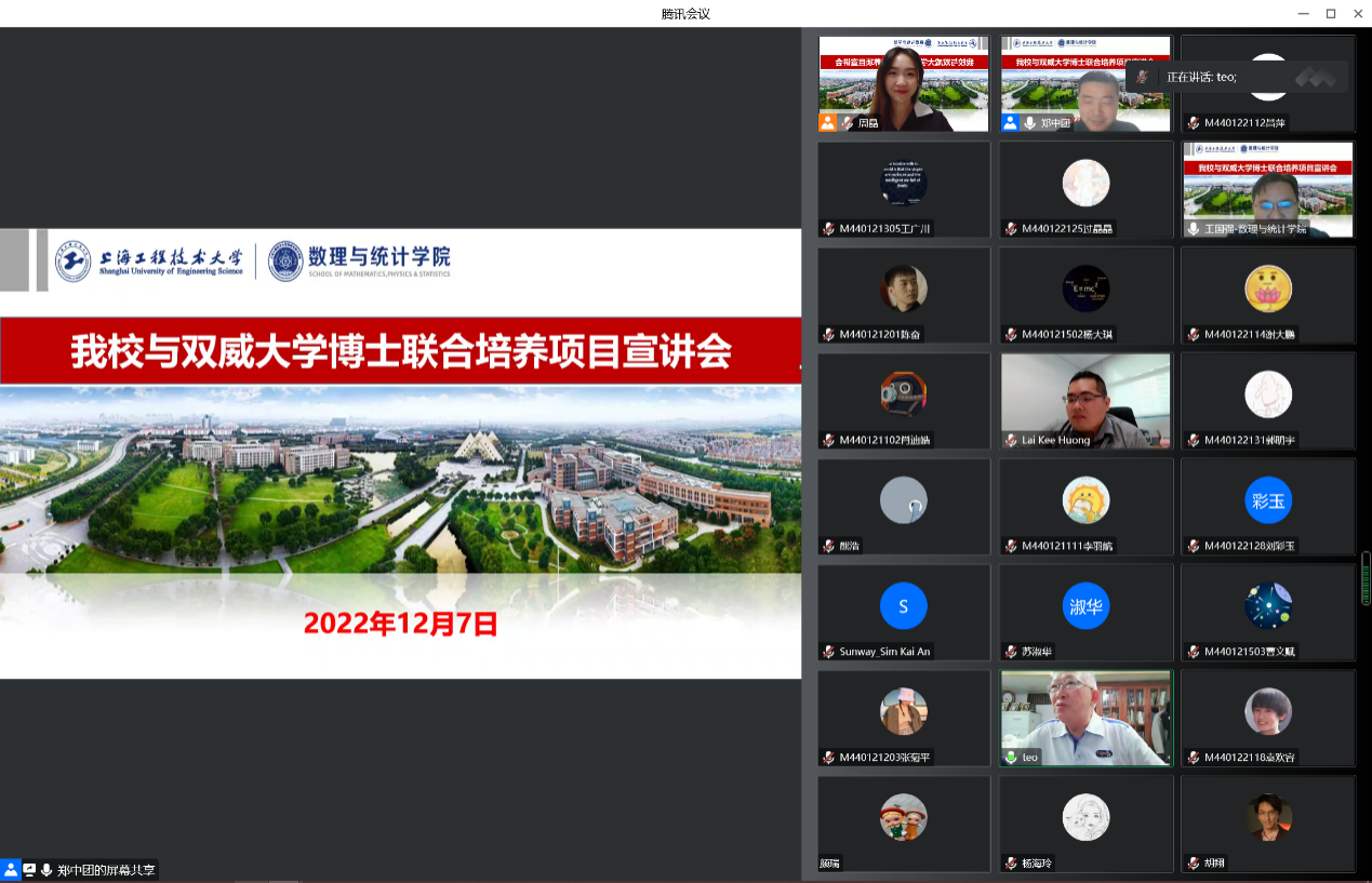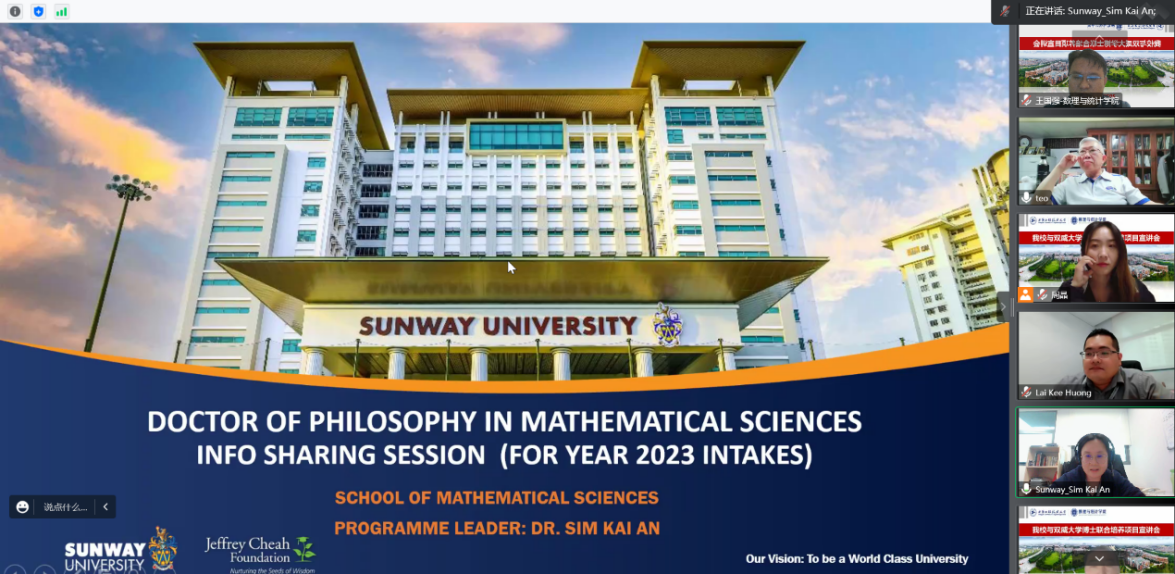 进一步推进国际化战略,提升研究生培养质量,12月7日下午,数理与统计学院同马来西亚双威大学数学科学学院就联合培养博士项目举办了线上宣讲会。马来西亚双威大学数学科学学院副院长Teo Kok Lay教授,副院长Lai Kee Huong博士,项目负责人Sim Kai An博士,数理与统计学院院长王国强教授、数学与统计系副主任郑中团副教授,学院国际交流秘书周晶博士以及统计学专业研究生参加会议。会议由郑中团副教授主持。