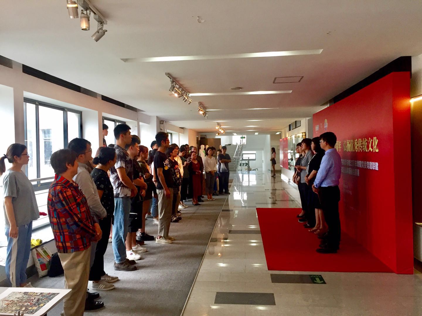 6月18日上午,“庆祝建党98周年 弘扬优秀传统文化”上海工程技术大学艺术设计学院党委与松江区车墩镇党委党建联建暨“非遗”进校园丝网版画主题展开幕,本次活动由艺术设计学院党委与车墩镇党委主办,车墩镇文化体育服务所、车墩镇版画创作基地承办。松江区车墩镇党委副书记张军梅,车墩镇党委委员钱苏南,车墩镇副镇长梅志芳,上海工程技术大学党委组织员熊伟,校研究生部副部长吕宁,艺术设计学院党委副书记刘江,车墩镇党群办主任龚永美,车墩镇党建服务中心主任叶国贤,车墩镇文体所负责人陆群,车墩镇社保中心主任王颖,上海叁零文化创意产业园党支部书记陈姬,车墩镇丝网版画基地负责人张玉良以及艺术设计学院党政领导班子、艺术设计学院部分师生出席了席开幕式。开幕式由艺术设计学院党委副书记刘江主持。