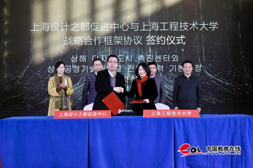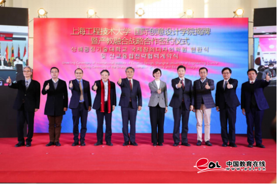在与会领导嘉宾见证下,上海工程技术大学与上海设计之都促进中心签署了战略合作框架协议,国际创意设计学院与中韩两国四家合作企业签署了产学合作协议。