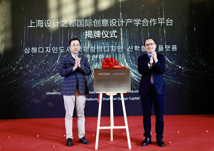 俞涛校长和上海设计之都促进中心理事长张展共同为“上海设计之都国际创意设计产学合作平台”揭牌。张展理事长表示,希望能充分发挥院校合作的各方优势,以上海设计之都国际创意设计产学合作平台为载体,助力国际创意设计学院建设,推进上海设计“走出去”和海外设计“引进来”,服务上海“设计之都”建设。