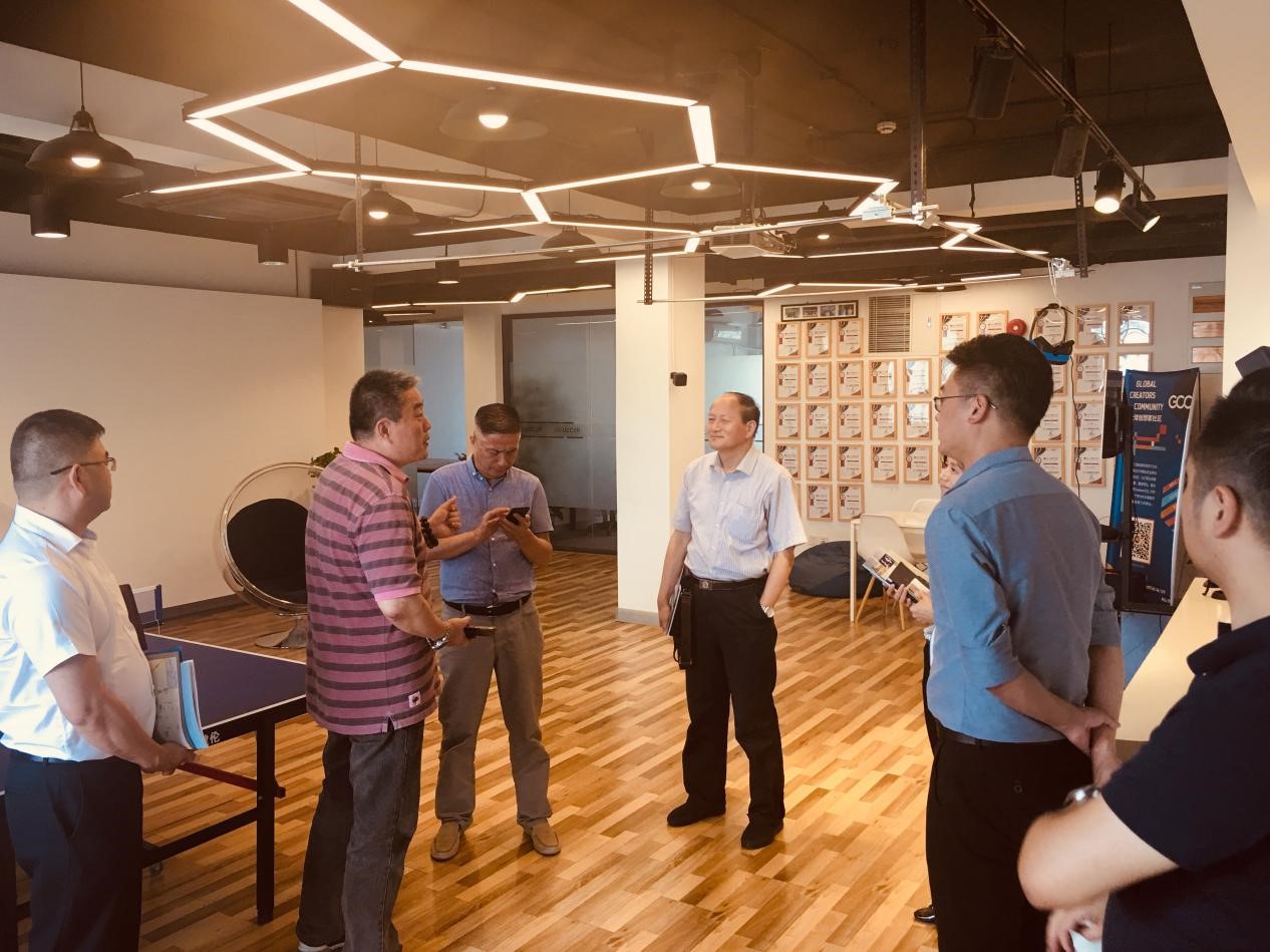 座谈会后,来访宾客在相关部门负责人陪同下,参观了UCCVR公司、星程文创专业孵化基地、垂直项目路演中心—分中心以及创客党建中心。