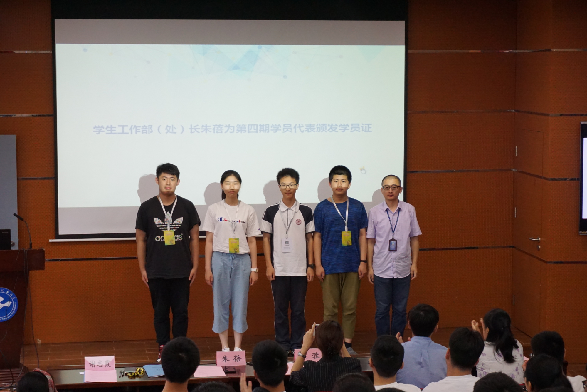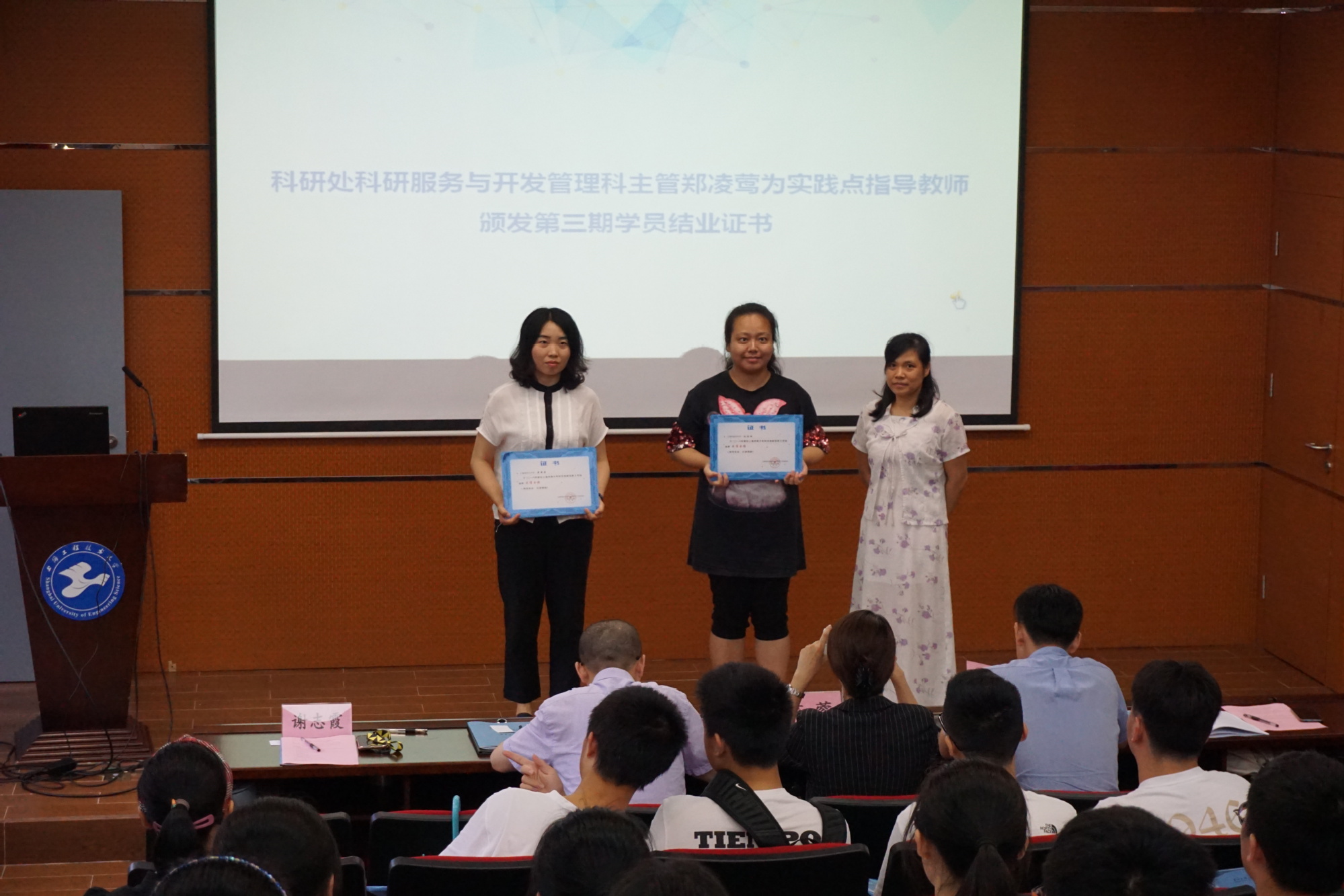 会上,学生工作部(处)副部(处)长李扬为第四期学员代表颁发学员证;校团委副书记石海雄宣读第三期优秀学员名单并颁发证书及赠书,科研处科研服务与开发管理科主管郑凌莺为实践点指导教师颁发第三学员结业证书。