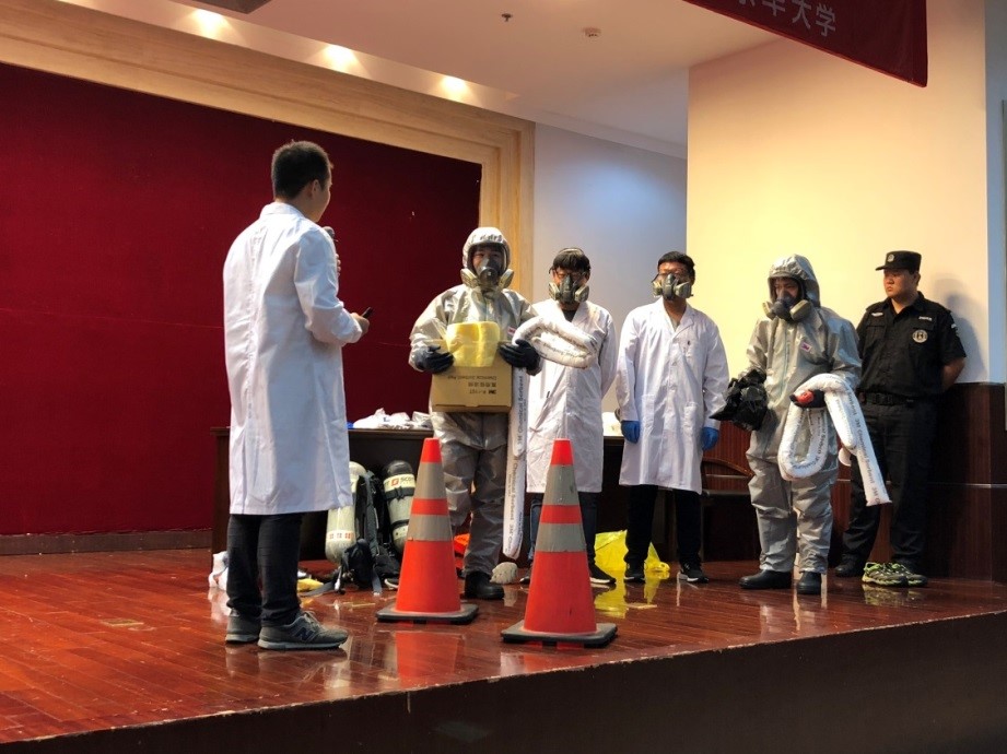最后分别以发生“500ml瓶装丙烯酸溶液操作PPE佩戴及泄漏处置演练”和“5加仑未知危险化学品废液泄漏,有浓烈刺鼻气味产生”两个突发事件进行应急演练。现场模拟了实验室的学生立即向学院报告事故,现场封锁及事故危害评估、事故上报程序、应急救援人员的个人防护、消除危险源与现场恢复,最后指挥官宣布现场应急处置反应结束。通过此次演练,使学生们对应急处置过程有了直观的认识和了解,更加深刻的记忆出现事故时的处理过程。