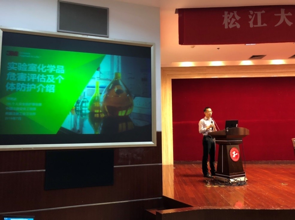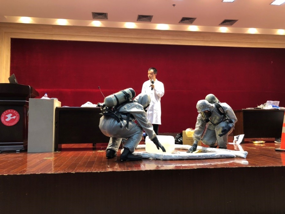 上午的活动首先由3M公司国家注册安全工程师、美国注册工业卫生师(CIH)邓明达经理做实验室化学品危害评估及个体防护知识培训。他同时介绍了实验室发生危险化学品泄漏时应遵照的处置流程及个体防护装备配备要求,并针对设定的不同场景邀请老师学生进行体验式实操演练。