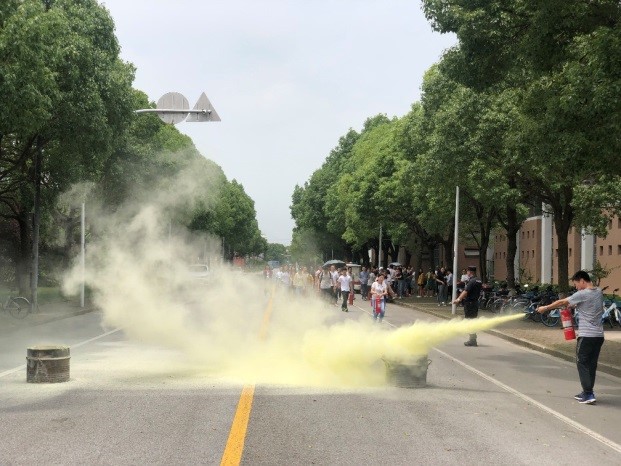 接下来,保卫处安全生产办协同化工学院实验室组织校内危险化学品从业取证人员开展了危险化学品从业人员培训及灭火器实操演练。保卫处陈嘉灏老师详细讲解了灭火器的种类、使用方法、日常维护等相关知识,并现场示范了干粉灭火器的使用步骤。化学化工学院师生随后有序到达指定的演练区域,按照学习的使用方法对模拟火场进行了实地扑救。