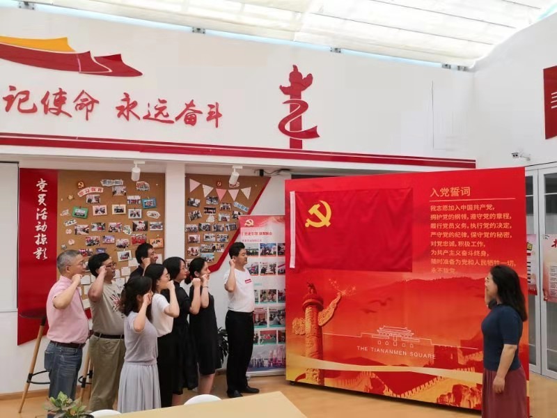 随后,怀着对革命前辈的无比敬畏之心,党员们面对党旗,举起右手、握紧拳头,重温入党誓词,以坚定有力的宣誓声,表达不忘初心、牢记使命,永远保持共产党人顽强拼搏、百折不挠的革命精神和坚定理想信念的决心。最后整个活动在《不忘初心》的歌曲传唱声中结束。