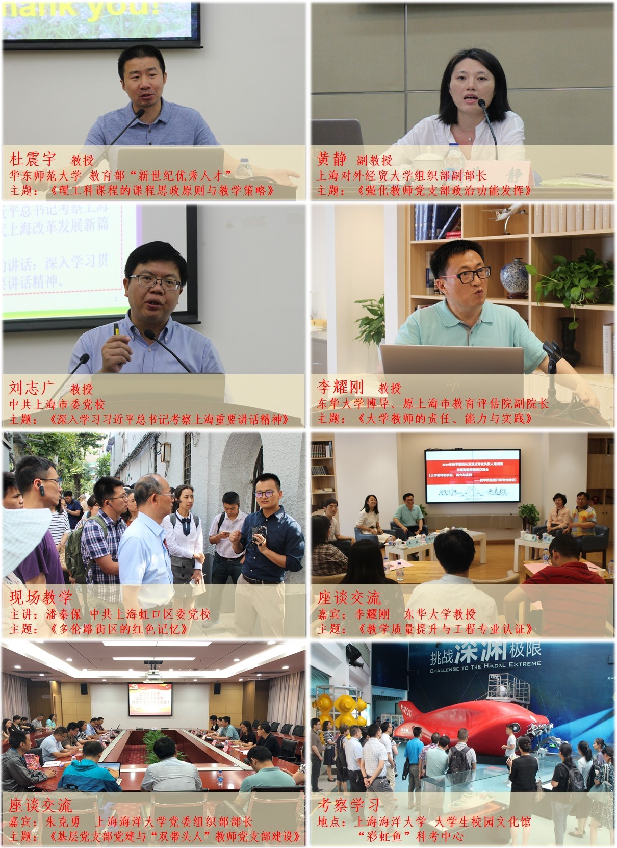 本次“双带头人”教师党支部书记培训班和教学副院长及重点专业负责人培训班,在充分研究两者需求共性的基础上,将部分含金量较高的主旨报告在两个培训班之间实现了共享,同时也做了突出侧重、体现特色的差异化教学安排。培训班采取专题报告、案例讨论、小组讨论、座谈交流、学员论坛、现场教学、实地考察等多种形式,内容涵盖了贯彻学习习近平总书记考察上海重要讲话精神、理工科课程思政建设、高校教师党支部政治功能的发挥、教学质量提升与工程专业认证工作研讨、“多伦路街区的红色记忆”现场教学以及与兄弟院校交流基层党支部党建工作经验等多个方面。
