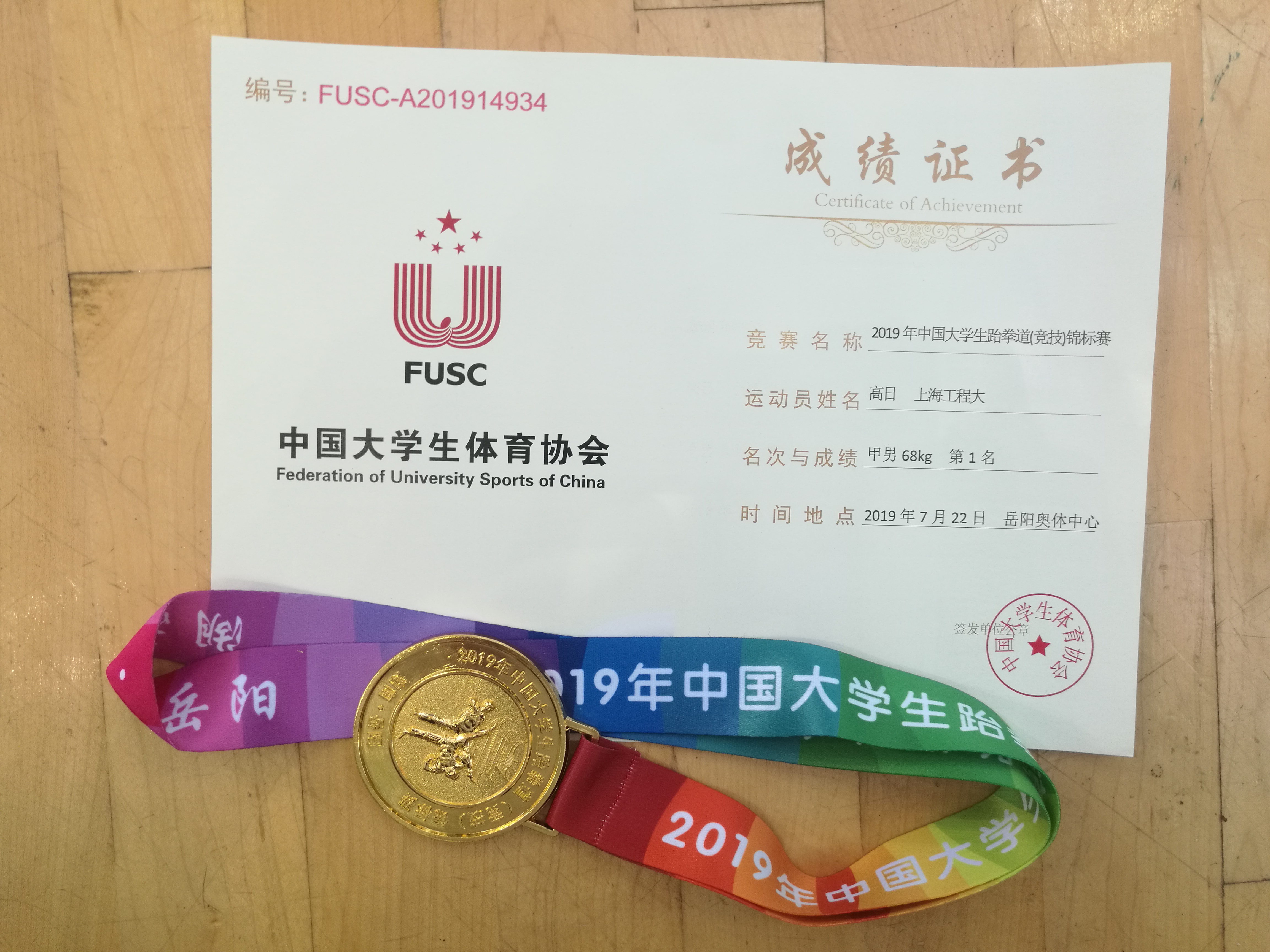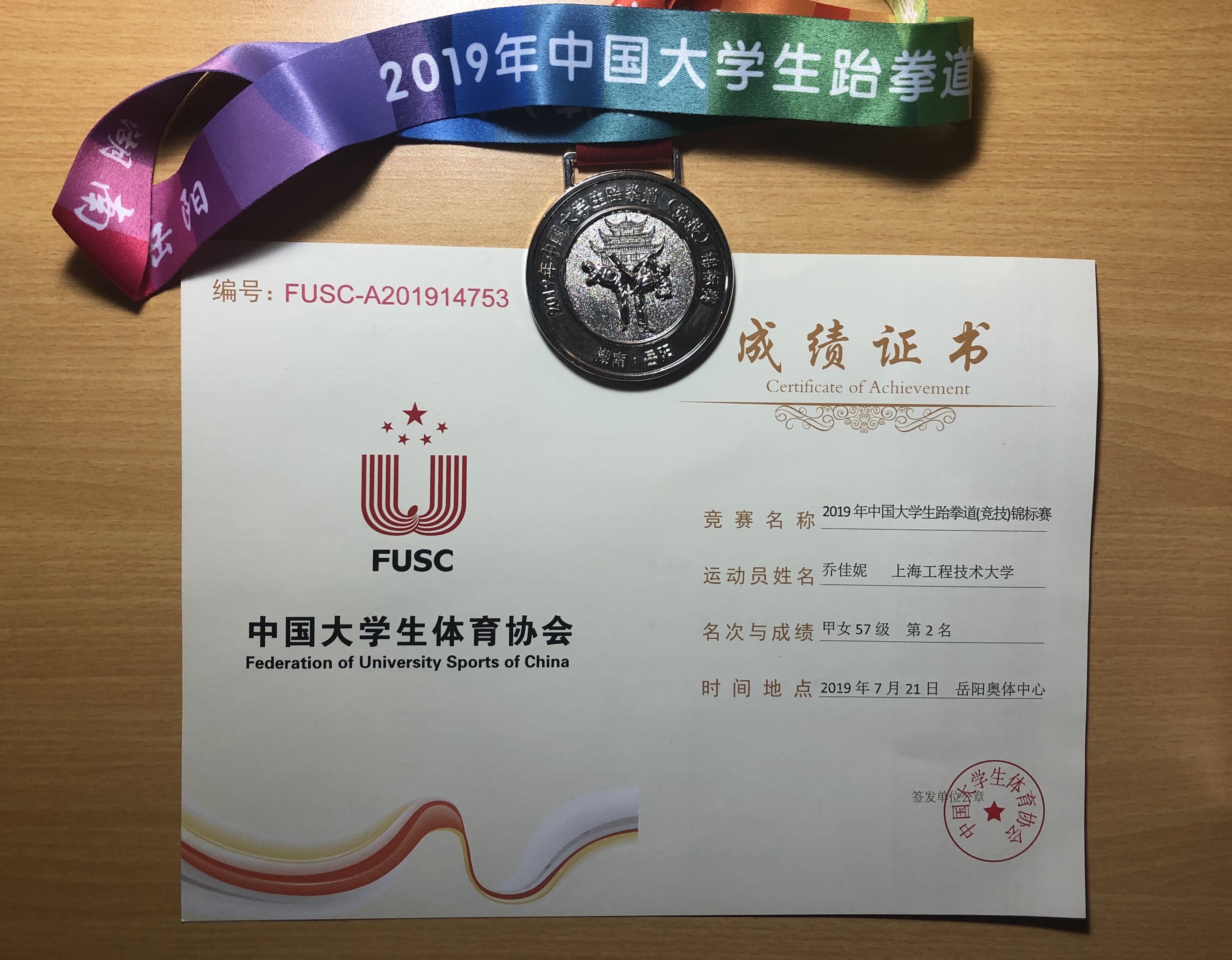 7月21日,在湖南岳阳举行的2019年中国大学生跆拳道锦标赛(竞技)比赛中,我校学子不负众望取得优异成绩,来自城市轨道交通学院的高日同学,经过奋力拼搏,勇夺男子68公斤级冠军,来自化工学院的乔佳妮同学获得女子57公斤级亚军。