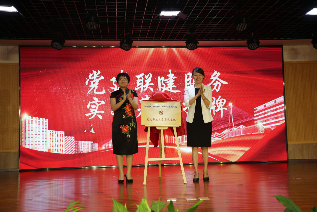 艺术设计学院党委书记袁蓉与镇党委书记杨其景,一起为“党建联建服务实践基地”揭牌。