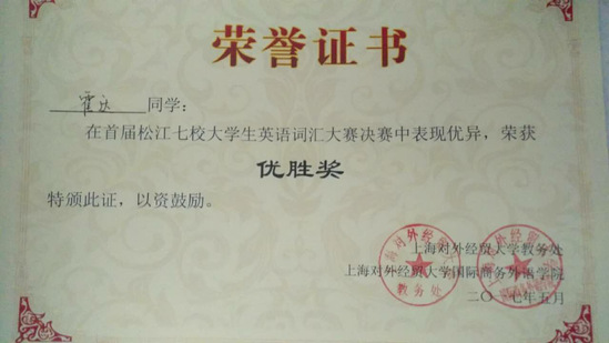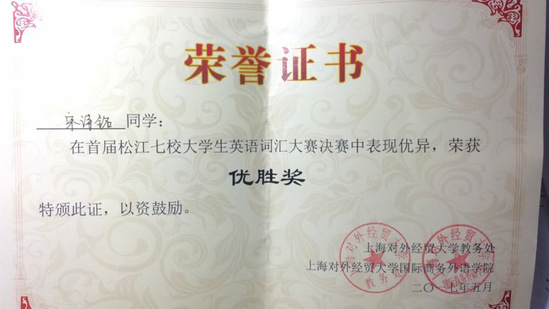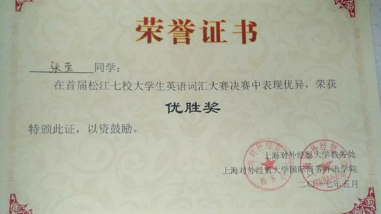 比赛主要是以四六级词汇为主,设置一等奖一名,二等奖三名,三等奖六名,优胜奖若干。本次比赛上海对外经贸大学有22位同学参加,其他院校共有学生12名。我校选手第一次参加该类型的比赛,三位同学都获得了优胜奖。
