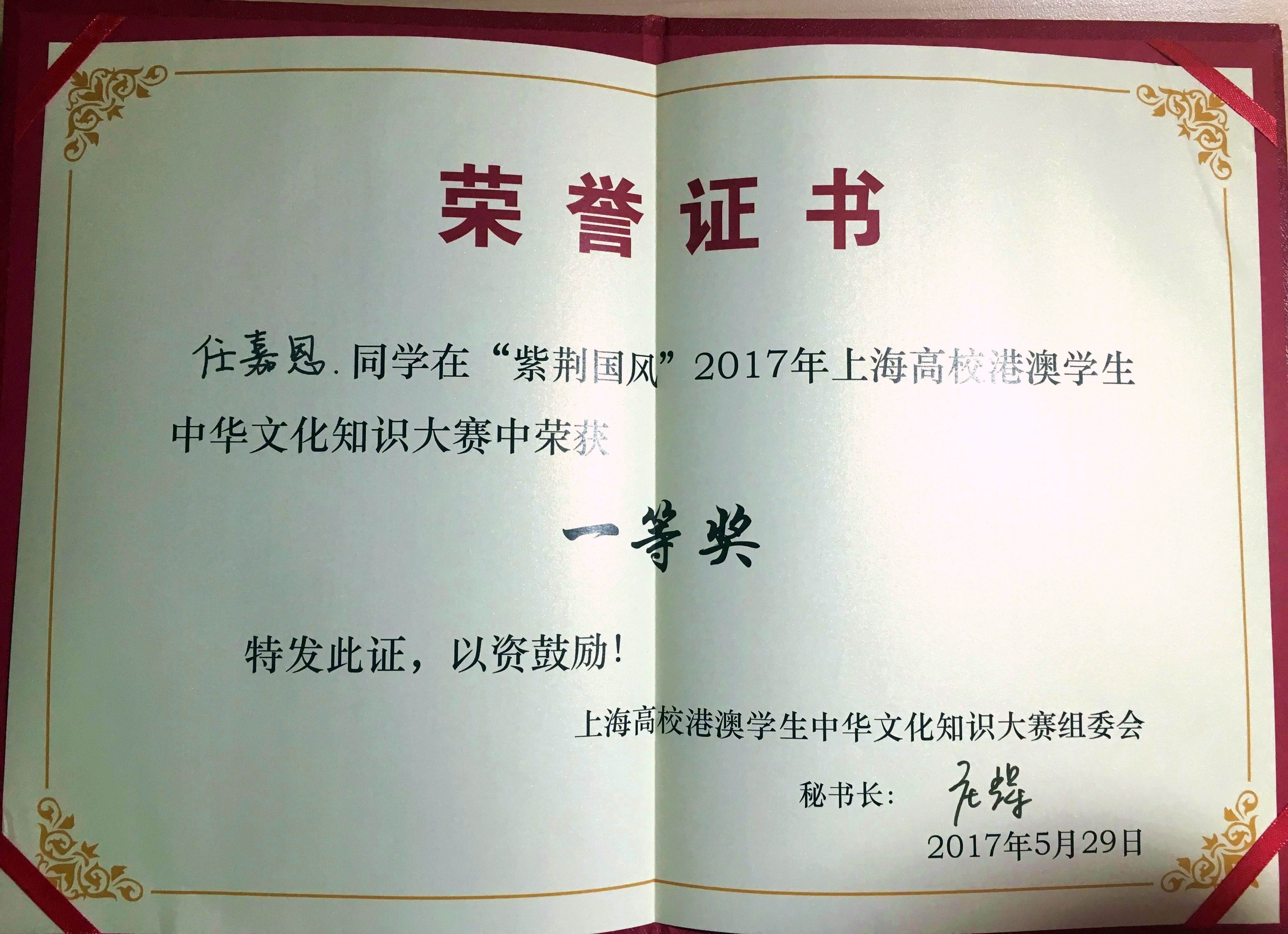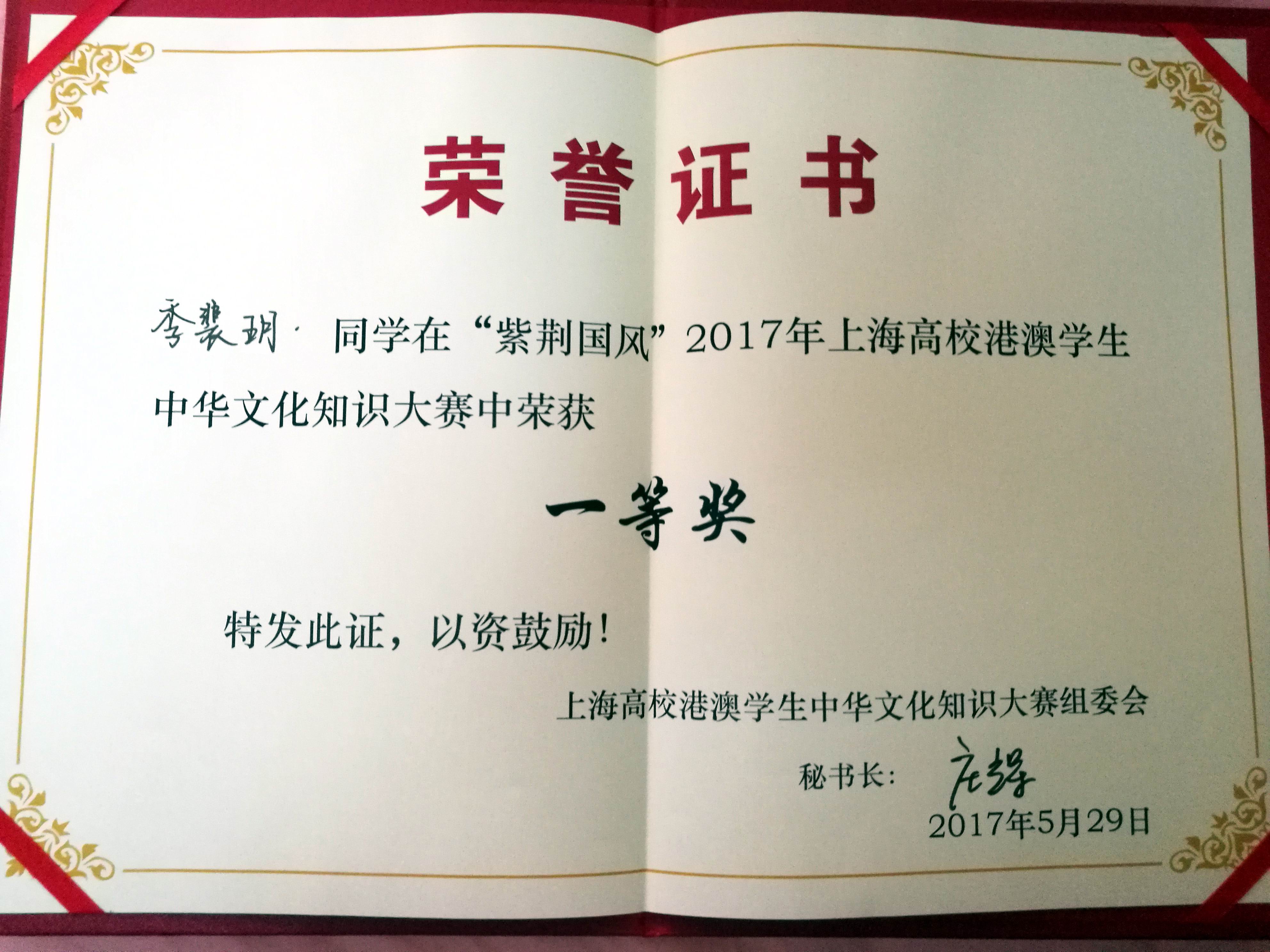 紫荆国风•上海高校港澳学生中华文化知识大赛是为纪念香港回归20周年而举办的大型文化赛事,邀请上海各高校港澳学生,以学校为单位组成队伍进行中华文化知识比拼。大赛主要分为“博览天地”、“诗海拾遗”、“洞若观火”和“心有灵犀”四个环节,竞赛题目涉及诗词歌赋、历史典故等文化知识,形式除选择、填空外,还包括乱序归原、你画我猜等新玩法。整个比赛采用紧张刺激的淘汰赛制,题目内容由易到难,层层推进,不时引来在座观众阵阵掌声。凭借着扎实的知识储备和良好的心理素质,我校选派的两名同学一路沉着应对,愈战愈勇,最终摘得本届比赛的冠军,充分展示了我校学子的实力与水平。