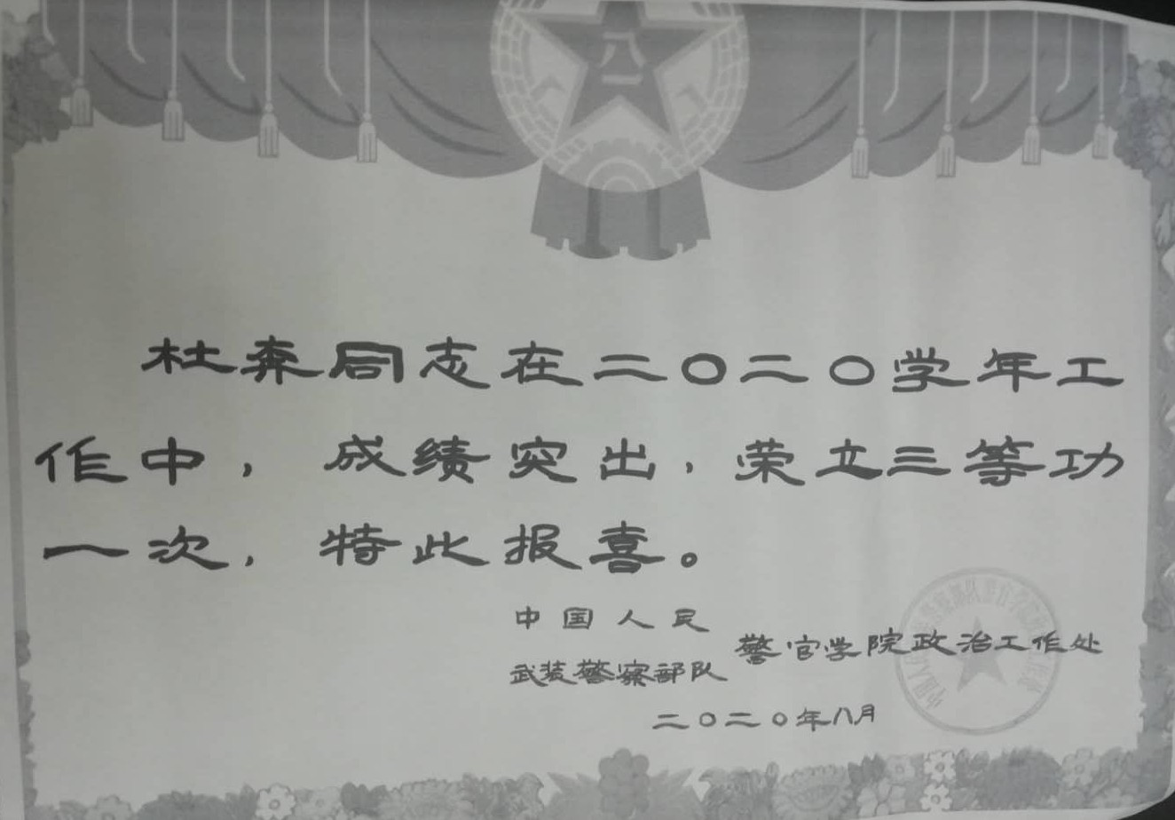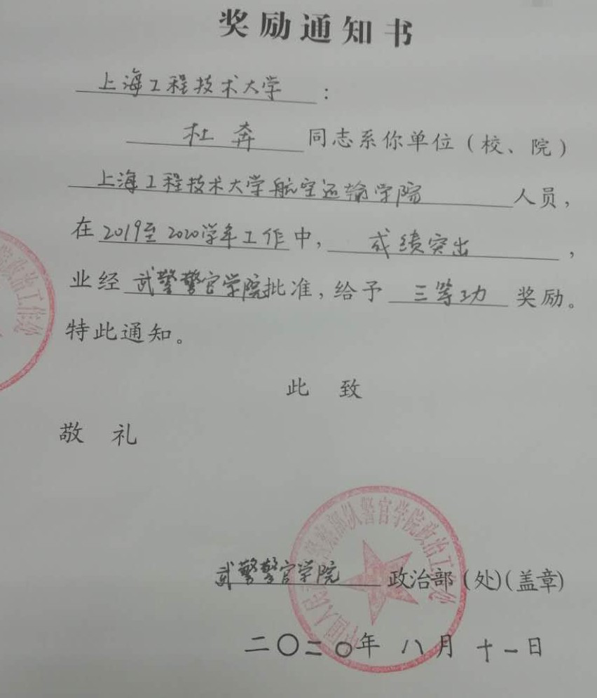 近日,一封来自武警警官学院的奖励通知书寄到了航空运输学院(飞行学院)学生工作办公室:我院入伍留队的杜奔同学于今年8月荣立三等功。
