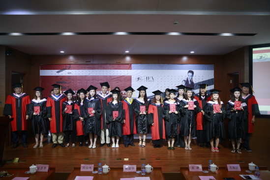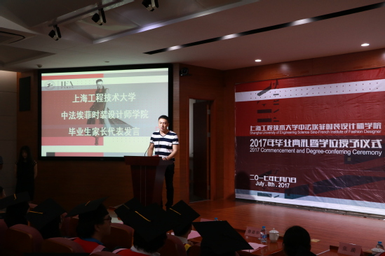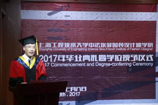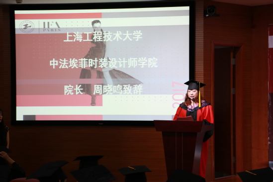 毕业典礼由中法学院院长周晓鸣致辞。她祝贺同学们在中法学院以“技术、艺术、市场相融合”为教学理念的培养下,进过四年的努力,在学习生活画上圆满的句号,在致辞中,她带领同学们又一次回顾了大学四年的大学生活,并告诉同学们,中法学院永远是他们的后盾,永远支持他们。