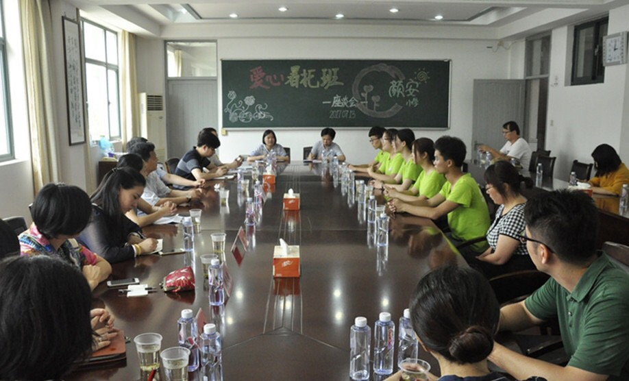 下午,校党委副书记、副校长史健勇,青浦区政府副区长王凌宇共同带队来到颜安小学爱心暑托班,慰问连日来坚守在暑托班工作岗位上的班主任和志愿者们。在座谈会上,校党委副书记、副校长史健勇对大学生志愿者们以自身实际行动积极践行社会主义核心价值观的精神给予了充分肯定,勉励大学生志愿者们不怕困难、勇于接受挑战,在实践中不断学习成长。他表示,学校要将爱心暑托班作为学校产学合作计划的重要部分,培养并选拔好优秀志愿者,为满足社会需求提供优质人才。王凌宇副区长充分肯定了志愿者们在过去两个星期辛勤的工作,对全体志愿者、教师们爱岗敬业、默默奉献的精神表示感谢,希望在接下来的暑托班办班过程中,继续将安全放在首位,更好地加强组织管理,做好统分结合,进一步提升“爱心暑托班”的工作实效。在慰问过程中,领导们认真观摩了内容丰富、生动有趣的志愿课程;仔细查看了暑托班的配套设施、师资配备、课程安排、工作日志等办班情况;详细询问了孩子们在暑托班里的学习感受和学习情况;并为班主任老师、志愿者们送上了防暑降温用品。