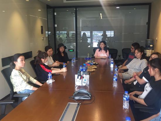 7月25日下午,服装学院党委副书记,中法埃菲时装设计师学院学生工作负责人张漪,中法埃菲时装设计师学院辅导员陈寅珕、姚佳慧,顶着高温红色预警,前往位于柳州路的产学研共建企业 百丽集团,并看望了在该集团工作的2016届及2017届校友们。百丽国际新业务事业部人事总监拓红女士,人事经理张小姐,以及人事专员刘蓓女士热情接待了来访的三位老师。
