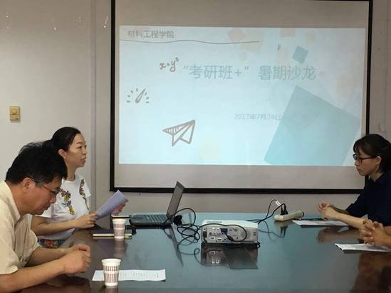 7月24日材料工程学院在行政楼1612举行了“考研班+、科创班暑期沙龙”活动,在炎炎夏日中,与学生分享考研、科研经验,为备战考研的学子送上清凉大礼包。材料工程学院党委书记于治水教授与副书记梅元媛老师出席了本次活动,参加本次活动的还有考研学生代表及研究生代表。