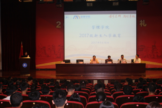 为使管理学院新生尽快了解学院、适应大学生活,管理学院于9月16日下午在志宏堂召开2017级新生入学教育,出席入学教育的有校党委副书记、副校长兼管理学院院长史健勇、学院党委书记周洁、副院长胡斌、孟勇、李跃文,以及学院2017级辅导员和全体新生,入学教育由学院党委副书记范君晖主持。