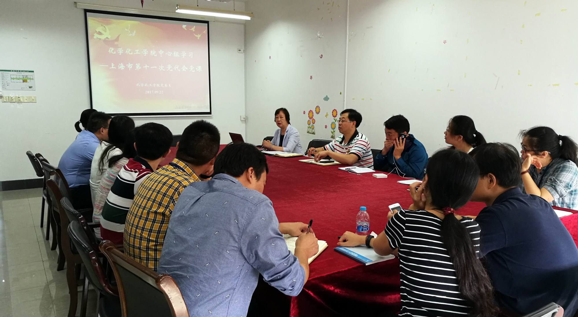 9月22日下午,化学化工学院党总支在实训楼4405组织学院中心组成员学习上海市第十一次党代会精神,刘宇虹书记以《共绘愿景,开创新局》为题上了专题党课。