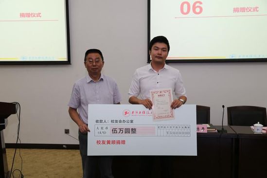 会上,副校长姚秀平代表校友会办公室接受优秀校友黄顺先生捐赠,黄顺在发言中表示,自毕业以来,自己始终对母校及老师心怀感激,在此仅以实际行动为母校尽绵薄之力,希望各位在校同学能珍惜校园时光,牢记恩师教诲,积极参加社会实践活动,拓展视野,实现自身价值。