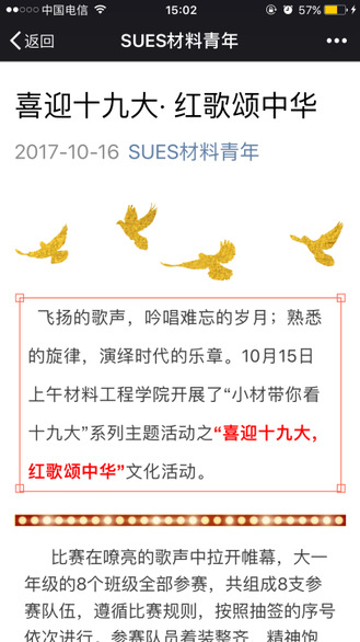 飞扬的歌声,吟唱难忘的岁月;熟悉的旋律,演绎时代的乐章。为喜迎中国共产党第十九次全国代表大会胜利召开,加强思想政治引领工作,培养学生爱党爱国情怀。于10月15日上午材料工程学院开展了“小材带你看十九大”系列主题活动之“喜迎十九大,红歌颂中华”活动。
