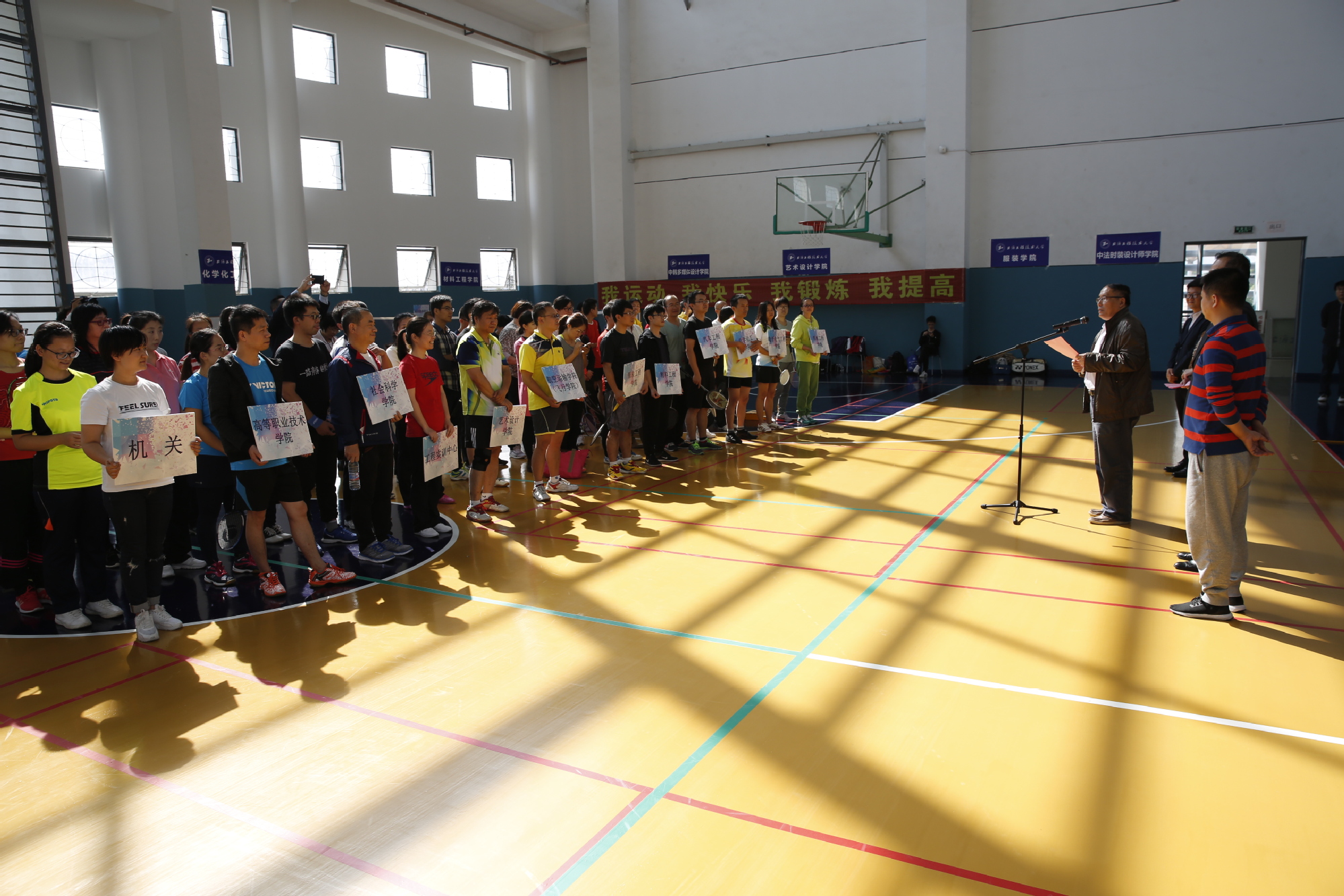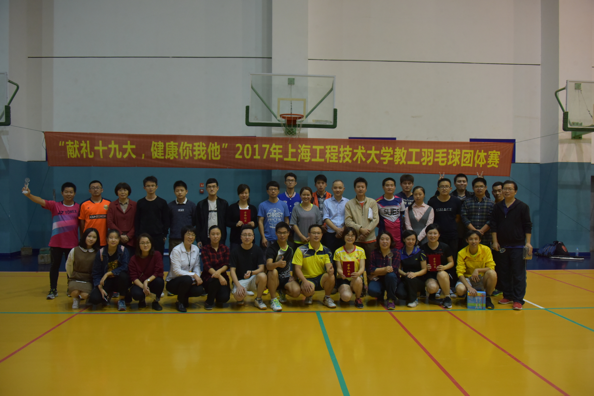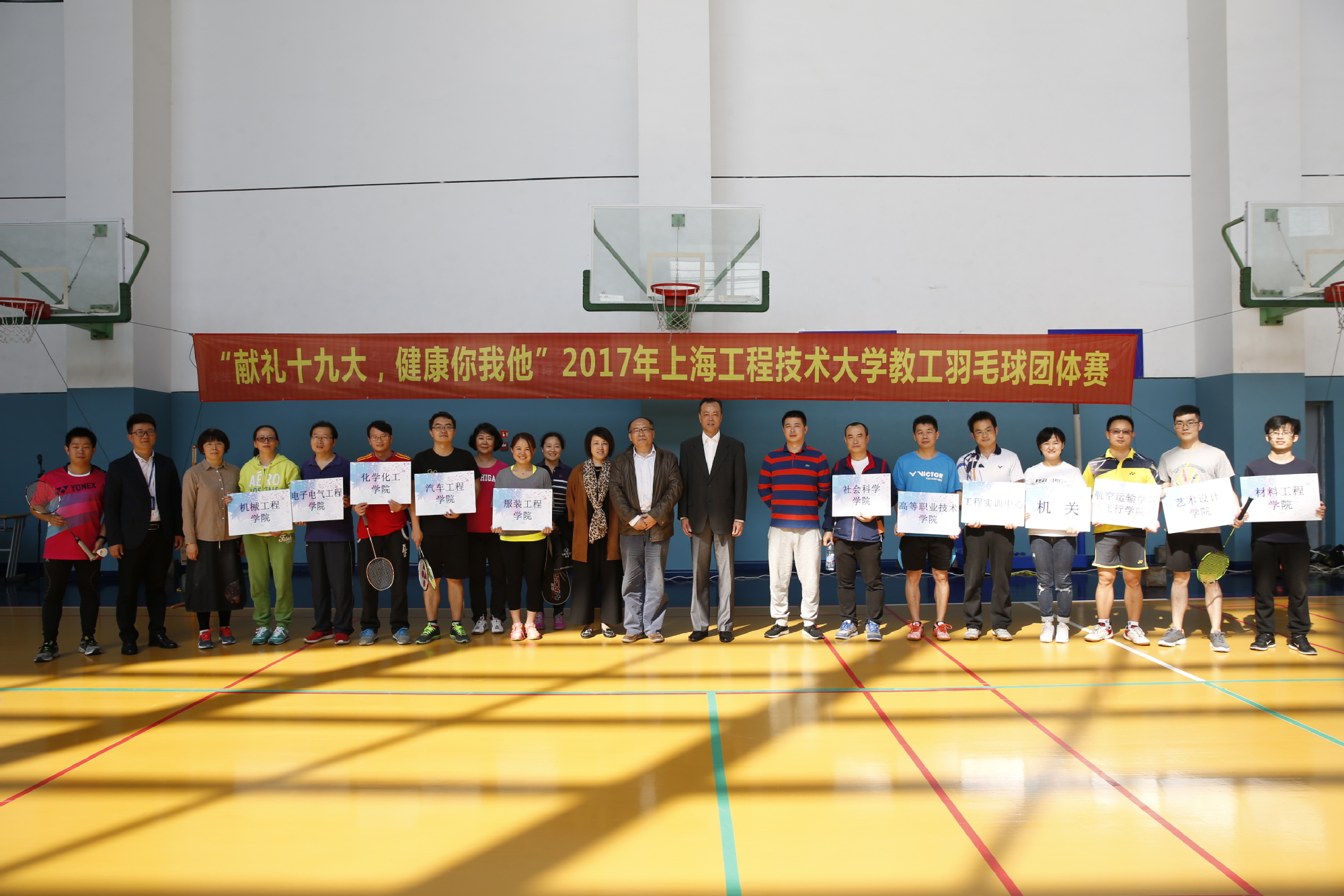 为进一步落实全民健身计划,丰富广大教职工业余文化生活,提升校园文化品味,10月20日下午,“献礼十九大•健康你我他”2017年上海工程技术大学教职工羽毛球团体赛开幕式在体育馆二楼训练馆顺利举行,校党委副书记、工会主席夏斯云,工会常务副主席柳如荣,体育教学部党总支书记茅华伟,工会副主席刘江出席了开幕式,共有来自全校12个部门约90人次教职工参加了比赛。开幕式由机械工程学院党委书记茅红柳主持。
