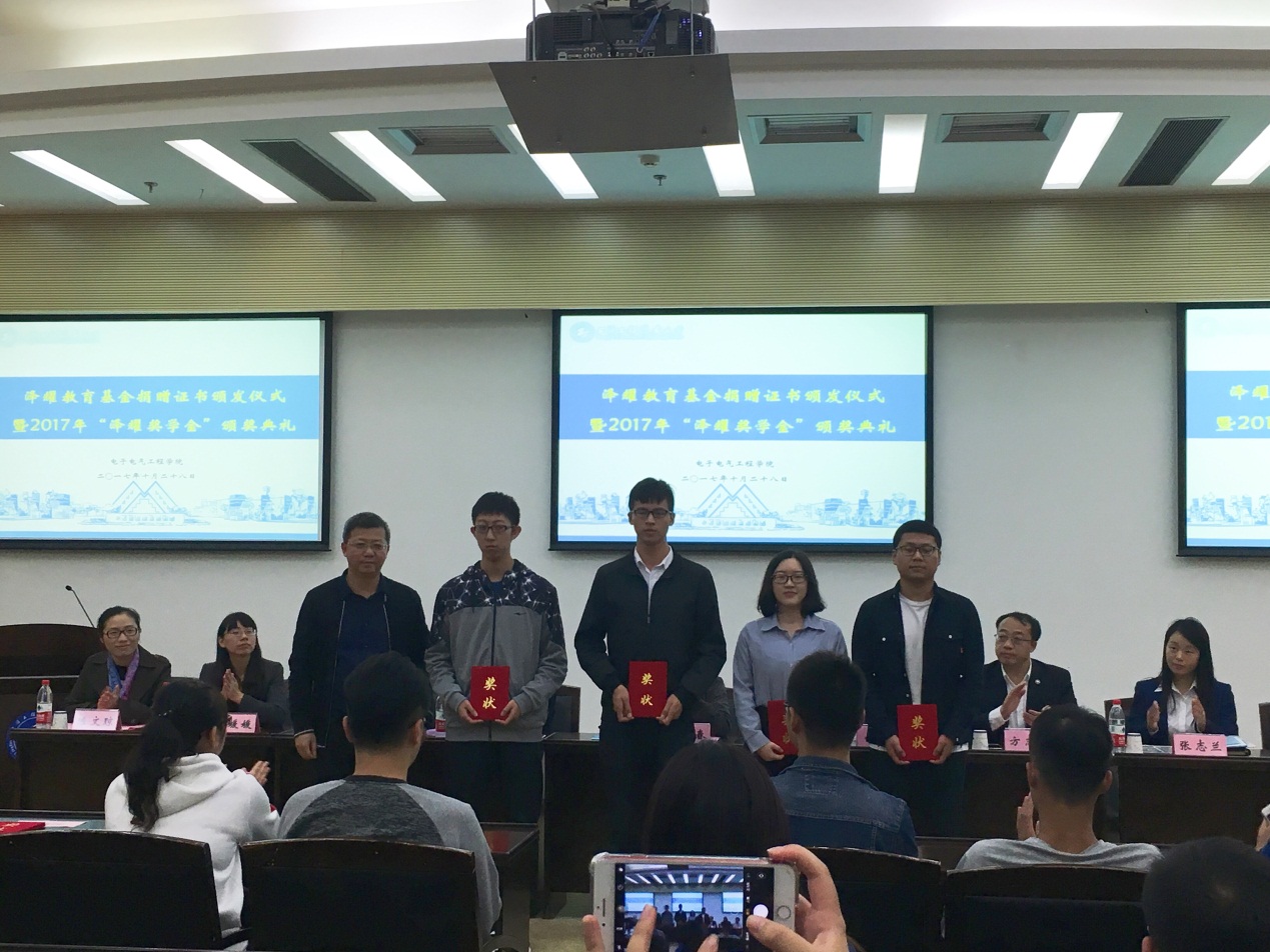 电子电气工程学院院长方志军、院党委副书记秦颖、副院长李媛媛分别宣读了“泽耀奖学金”一、二、三等奖获奖学生名单。上海泽耀环保科技有限公司董事长徐勇、总经理张志兰,电气学院副院长刘瑾分别向“泽耀奖学金”一、二、三等奖获奖学生颁发了获奖证书。