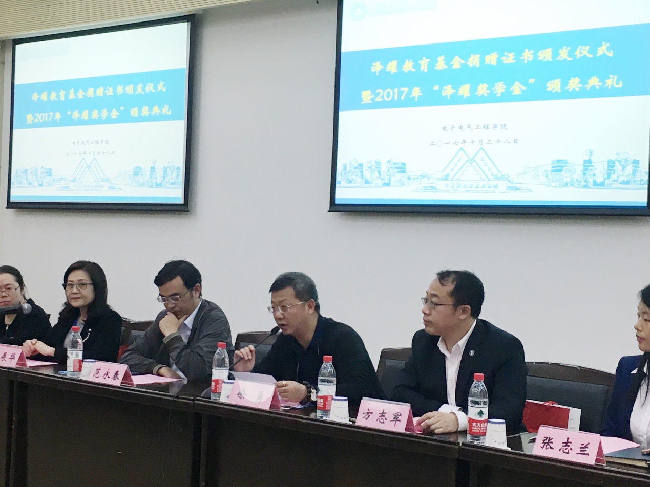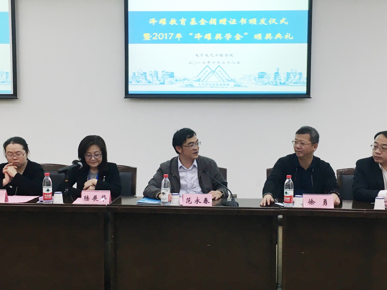 10月28日,我校建校39周年校友返校日下午,电子电气工程学院在图文信息中心第三报告厅举行2017年泽耀教育基金捐赠证书颁发仪式暨泽耀奖学金颁奖典礼。上海泽耀环保科技有限公司董事长徐勇、上海泽耀环保科技有限公司总经理张志兰,校党委副书记范永春,电子电气工程学院党委书记陆展华、院长方志军、副书记秦颖、副院长李媛媛、副院长刘瑾出席了颁奖典礼。学院学生工作办公室全体辅导员、学生代表和获奖同学参加了颁奖仪式,颁奖仪式由院党委书记陆展华主持。