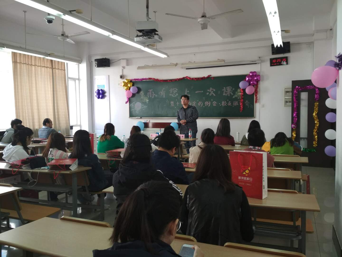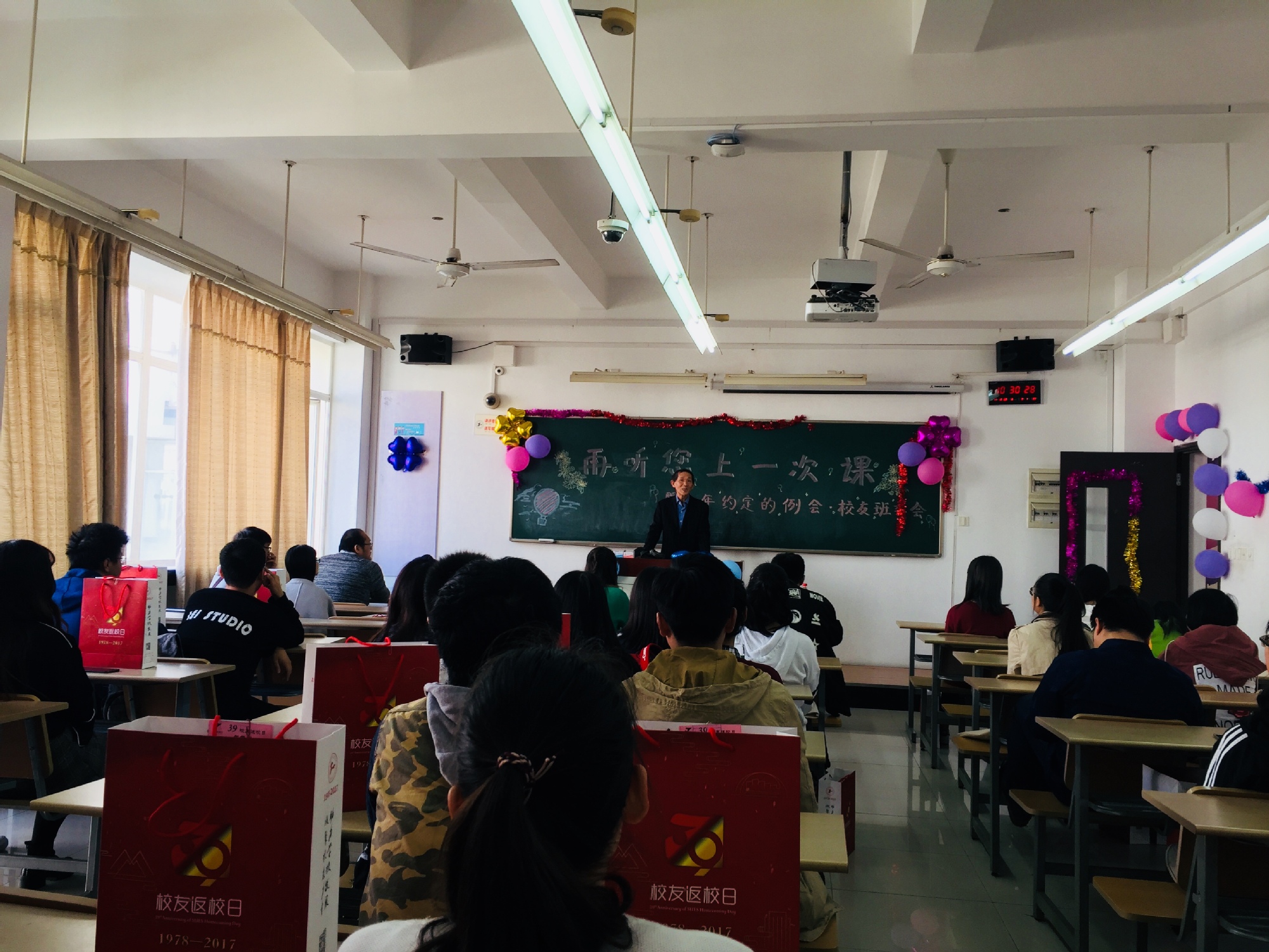 有人说,老师是一种情怀,是青涩年华里最美的引路人。在“再听您上一次课”活动中,学院邀请到了退休老教师潘惠德教授。几年来,潘老师一直坚持为学生上课、开讲座,凭借丰富的人生阅历和经验引导学生树立正确的世界观、人生观、价值观。今天,好似又回到了以前上学的日子,在这满满师生情的教室里,潘老师为学院返校的校友们带来了一节精彩的课。课堂上,校友们像以往上课一样认真做着笔记,听着老师的谆谆教诲,回忆着在母校的分分秒秒,不禁留下思念的泪水。潘老师课后,我们召开了十年约定的例会·校友班委会,与校友们共叙师生情和同学情。