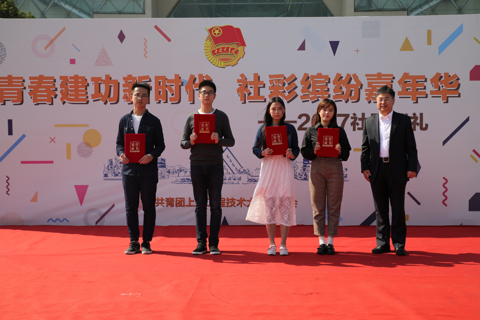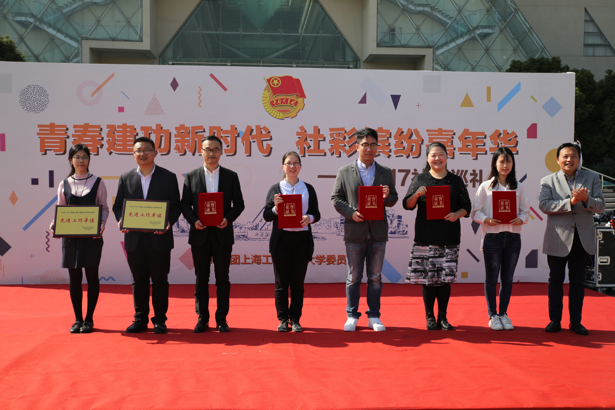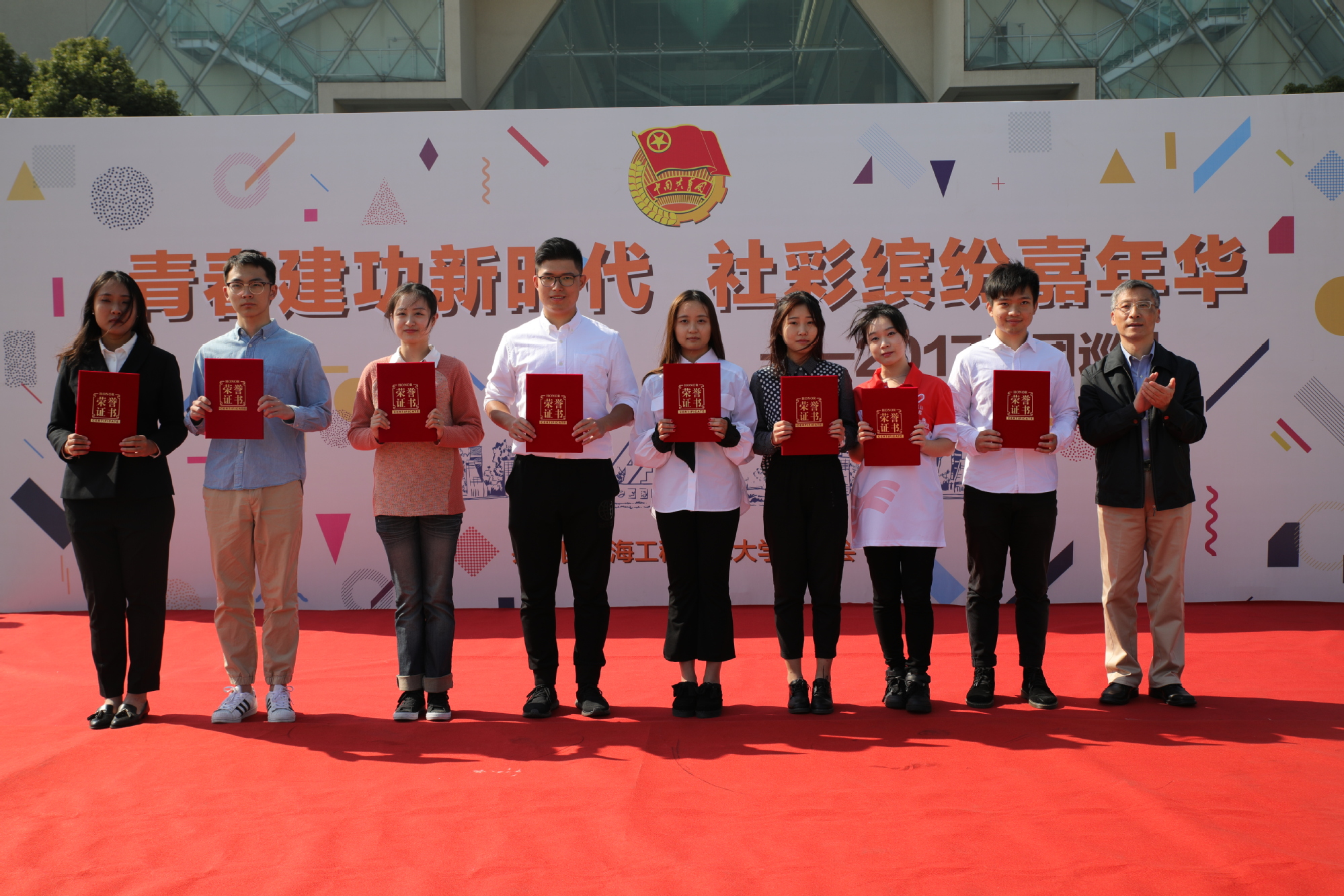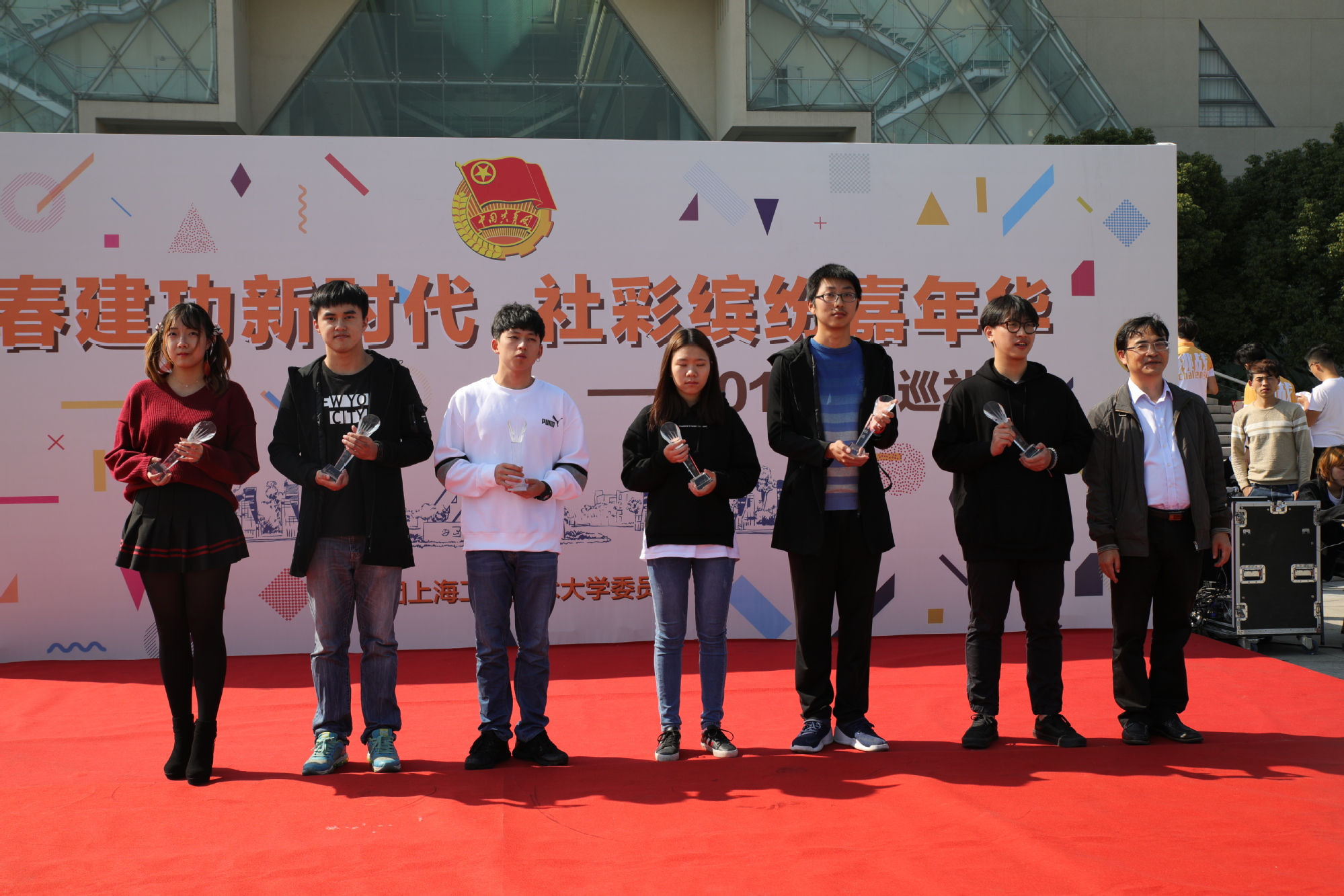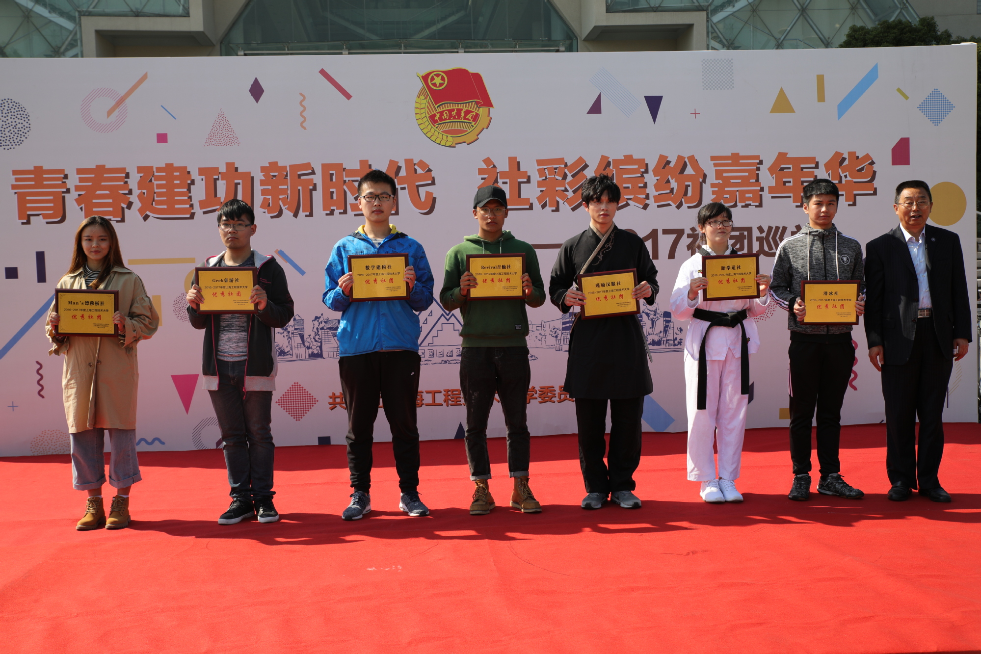 10月28日中午,“青春建功新时代 社彩缤纷嘉年华”社团巡礼颁奖仪式在图书馆前博学广场举行。校党委副书记、副校长史健勇,校党委副书记范永春,副校长姚秀平,副校长鲁嘉华及副校长王岩松出席了社团巡礼颁奖仪式;学校相关职能处室负责人、校友代表、获奖社团师生代表及松江七校40余家优秀社团,共计500余人参加了本次活动。