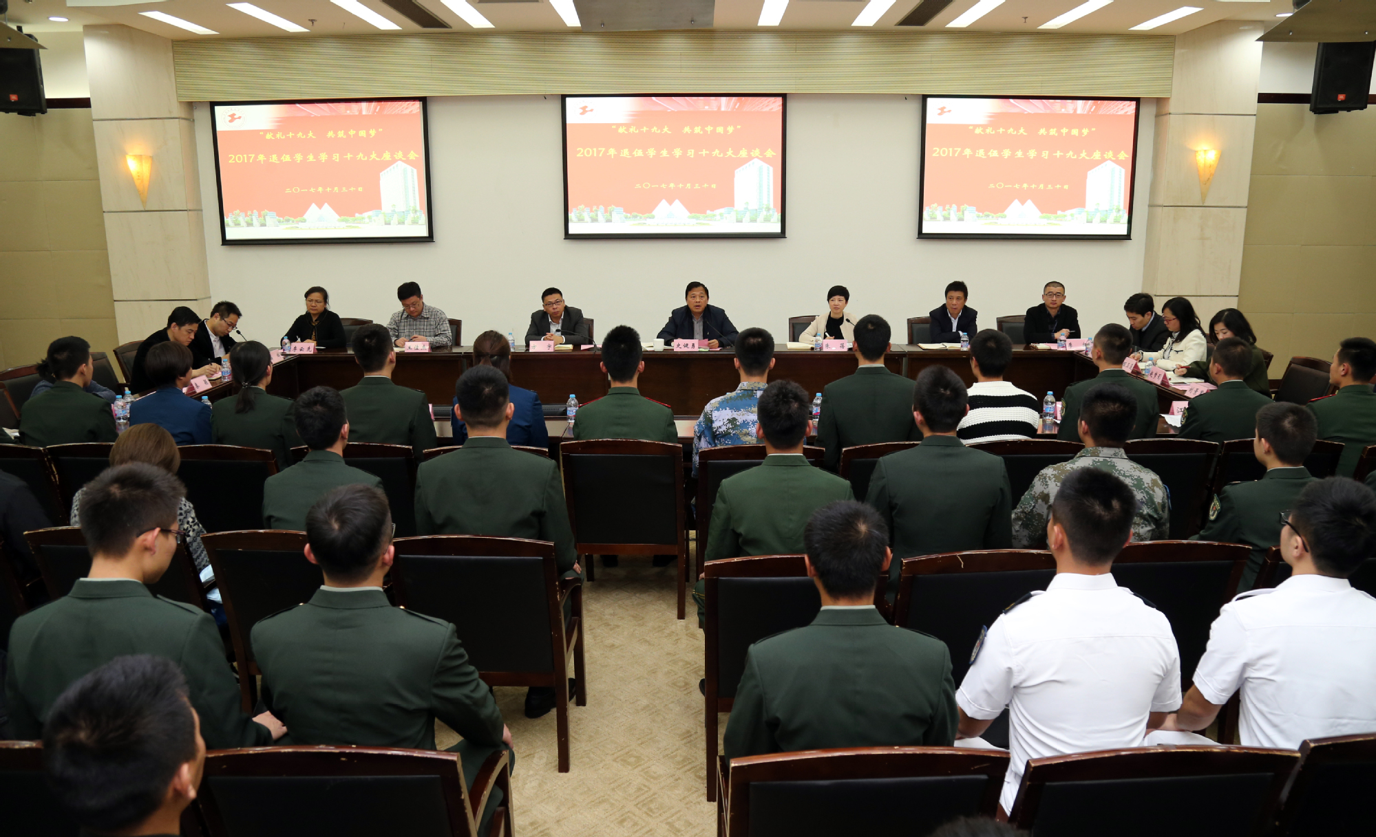 10月30日,学校在图文信息中心第三报告厅召开2017年退役复学学生学习十九大座谈会。校党委副书记、副校长史健勇,学生工作部(处)、武装部部长朱蓓、教务处处长方宇、后勤实业发展中心主任鲁柏青、校团委书记王佳杰,相关学院党委(党总支)副书记、国防教育辅导员以及退伍复学学生参加会议。座谈会由校武装部办公室主任薛辉主持。