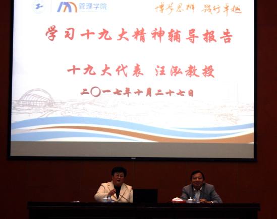 10月27日晚上,中共十九大代表、中共上海市宝山区区委书记、管理学院学科带头人汪泓教授在行政楼B301做学习十九大精神专题辅导报告。管理学院、社会科学学院党政班子、全体教师、部分学生党员到会聆听学习。