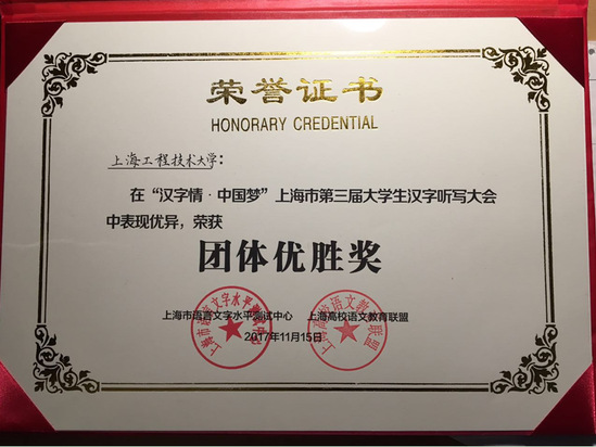 经校内初赛选拔,陈未琼、汪钰雯和黄鑫三位同学脱颖而出,代表上海工程技术大学参赛。进入半决赛,经过语言文字法律法规、现代汉语知识、古代汉语知识、汉字文化等环节比拼,我校代表队在22进8的比赛中与上海交通大学、华东理工大学和立信会计金融学院积分相同,并列第七。在附加赛中以一题之差负于华东理工大学,与上海交通大学并列第九,荣获团体优胜奖。上海外国语大学获得团体和个人赛第一名。