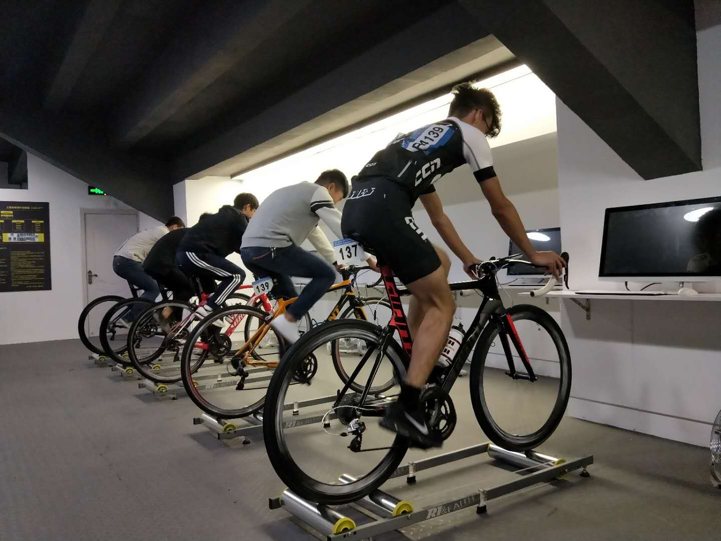 滚筒训练是一种在带有滚轮的架子上进行的训练形式,这种训练很考验骑手的平衡力,滚轮上没有任何防护,队员们即使穿着护具,也要十分小心,“滚筒训练能极大提高骑手的控车能力和耐力性,是每个骑手必须经历的修行。”说罢,队员们拿出车准备亲自演示一番,在此之前,他们拿出抹布仔细地擦拭着爱车,一来是清理污垢,更重要的是防止部件遇水生锈,平日里骑手还会定期将车进行全面护理一次,他们打趣道:“毕竟是‘大老婆’,肯定要好好爱惜。”擦拭罢,整装上车,队员们一改玩笑模式,各个专心致志起来,那一刻,他们的眼神中仿佛透出了光,写满了对骑行的热爱、坚持和不放弃,上海市自行车锦标赛团体第一名的荣誉名副其实。