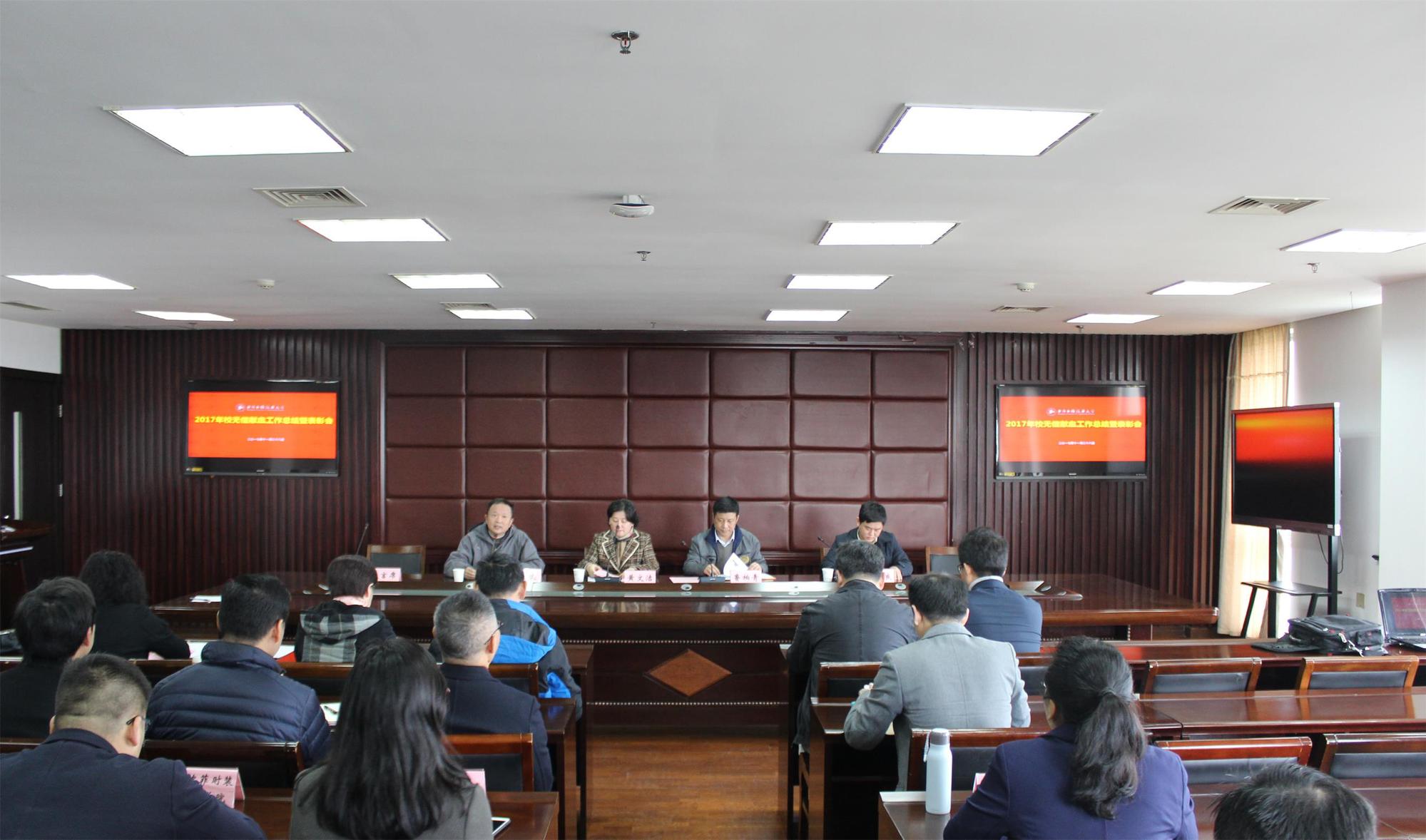 11月28日, 学校2017年度无偿献血工作总结暨表彰会在行政楼506室召开,相关部门、学院负责人及师生代表参加会议,会议由后勤实业发展中心副主任周斌主持。