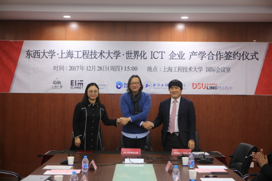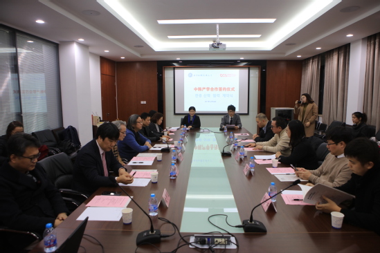 12月28日下午,中韩多媒体设计学院在我校仙霞校区教学楼103会议室举行学院、企业、协力团三方产学合作签约仪式。中韩多媒体设计学院吴亚生院长、金锺琪教授携专业教师与韩国东西大学产学协力团团长曺大洙、副团长金亨尤, 上海广涌文化艺术发展有限公司董事长赵云峰, 总经理金力, 上海爱琳信息科技有限公司总经理NA KYOUNG JOO, 上海赢赞数字科技有限公司总经理孙炜恒, 上海进画论信息科技有限公司总经理林宇丰等参加了本次会谈。