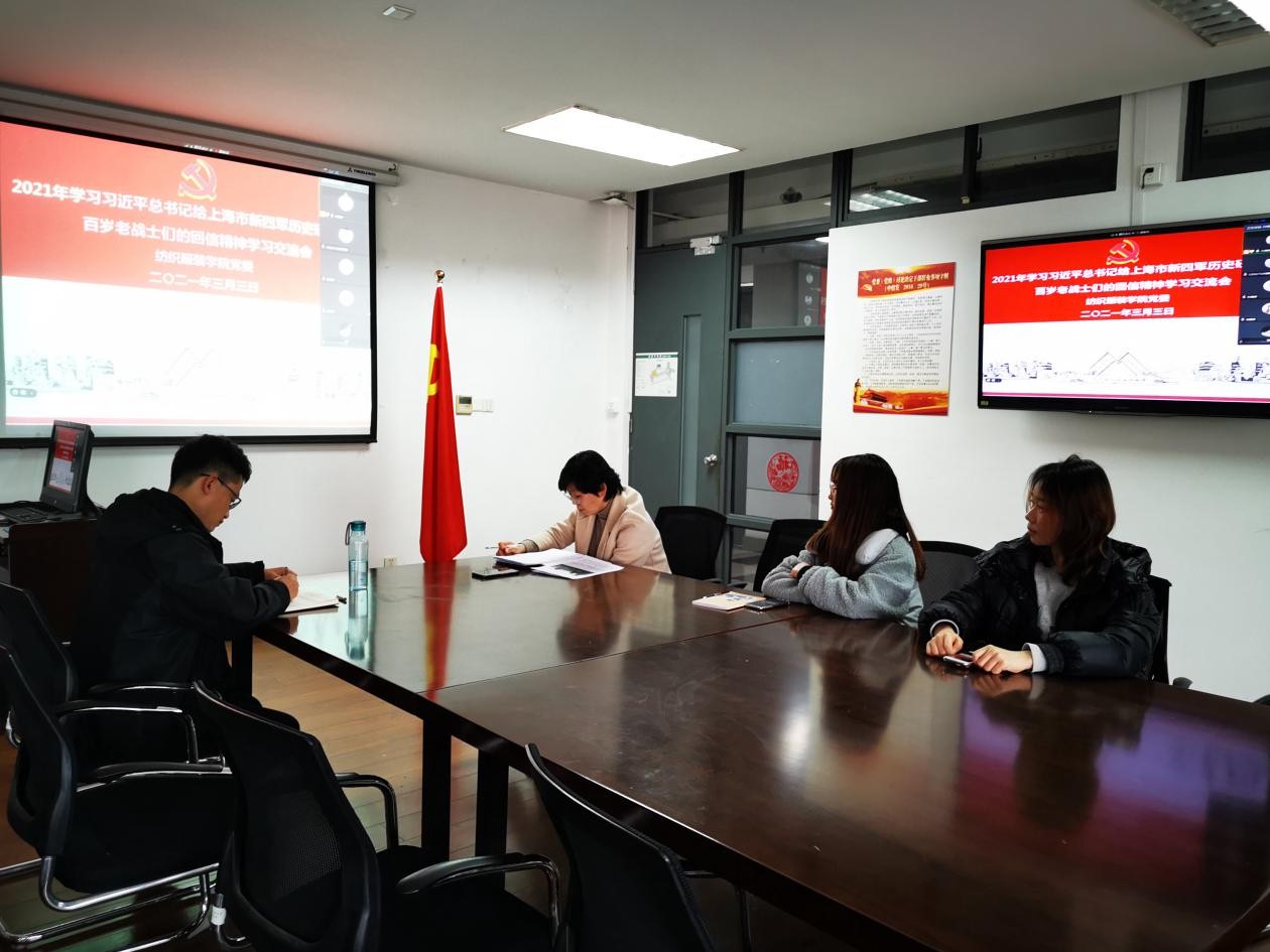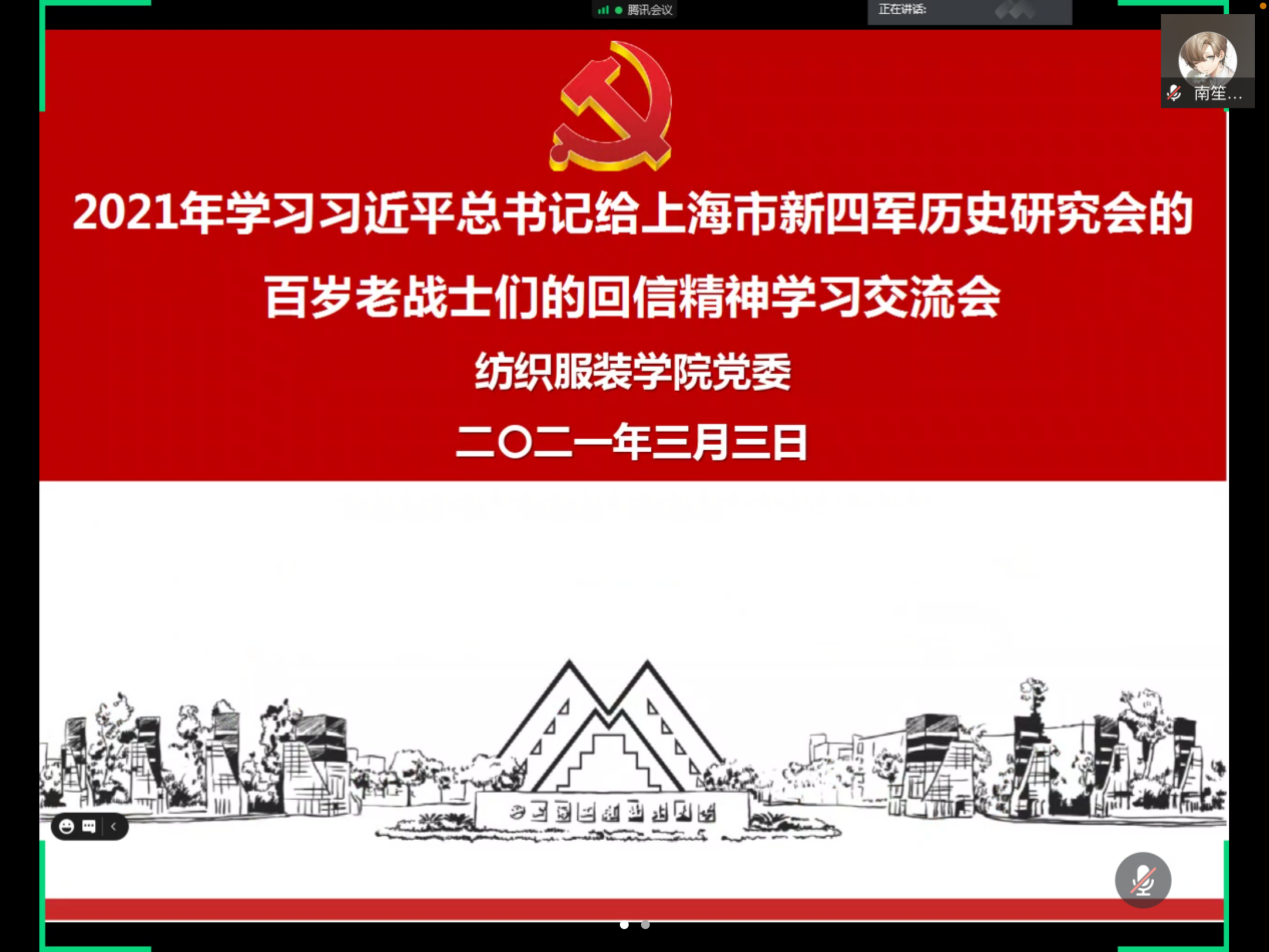 3月3日下午,纺织服装学院关工委召开学习习近平总书记给上海市新四军历史研究会的百岁老战士们的回信精神线上线下学习交流会,学院党委书记关工委主任朱君璇,关工委常务副主任张海成,关工委委员黄勤奋、孙熊、曹丽纳、张漪以及部分学生党员参会,会议由学院教师党员唐全主持。