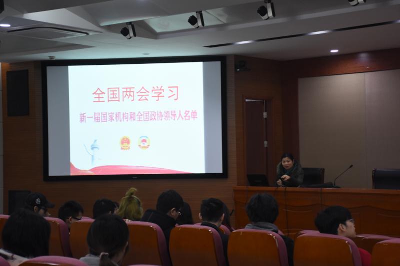 本次主题教育,张漪老师向同学们介绍了第十三届全国人民代表大会和中国人民政治协商会议的具体内容,传达了会议精神,要求同学们不忘初心、牢记使命、奋发有为,开新局于伟大的社会革命,强体魄于伟大的自我革命,创造出属于新时代的光辉业绩。号召同学们紧密团结在以习近平同志为核心的党中央周围,增强“四个意识”,坚定“四个自信”,在共同奋斗中汇聚起同心共筑中国梦的磅礴力量。随后,张漪老师向同学们一一介绍了新一届国家机构和全国政协领导人。最后,结合学院近期的活动,张漪老师向同学们介绍了关于宝山樱花节的非物质文化遗产礼品制作及开展了大学生无偿献血动员。