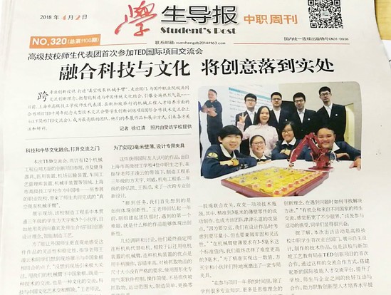4月2日,《学生导报》头版刊载题为融合科技与文化,将创意落到实处,高级技校师生代表团首次参加TED国际项目交流会的报道。文章称本次出访活动是高级技校中职学生首次走出国门,展示自主设计、制作的技术作品,也是该校与新加坡工艺教育局在TED创新项目的首次合作。通过这样的交流合作方式,搭建起新的国际技能人才交流平台,提升了学校、师生与企业之间的良好互动与合作,助力职教创新型人才培养水平提升。全文如下: