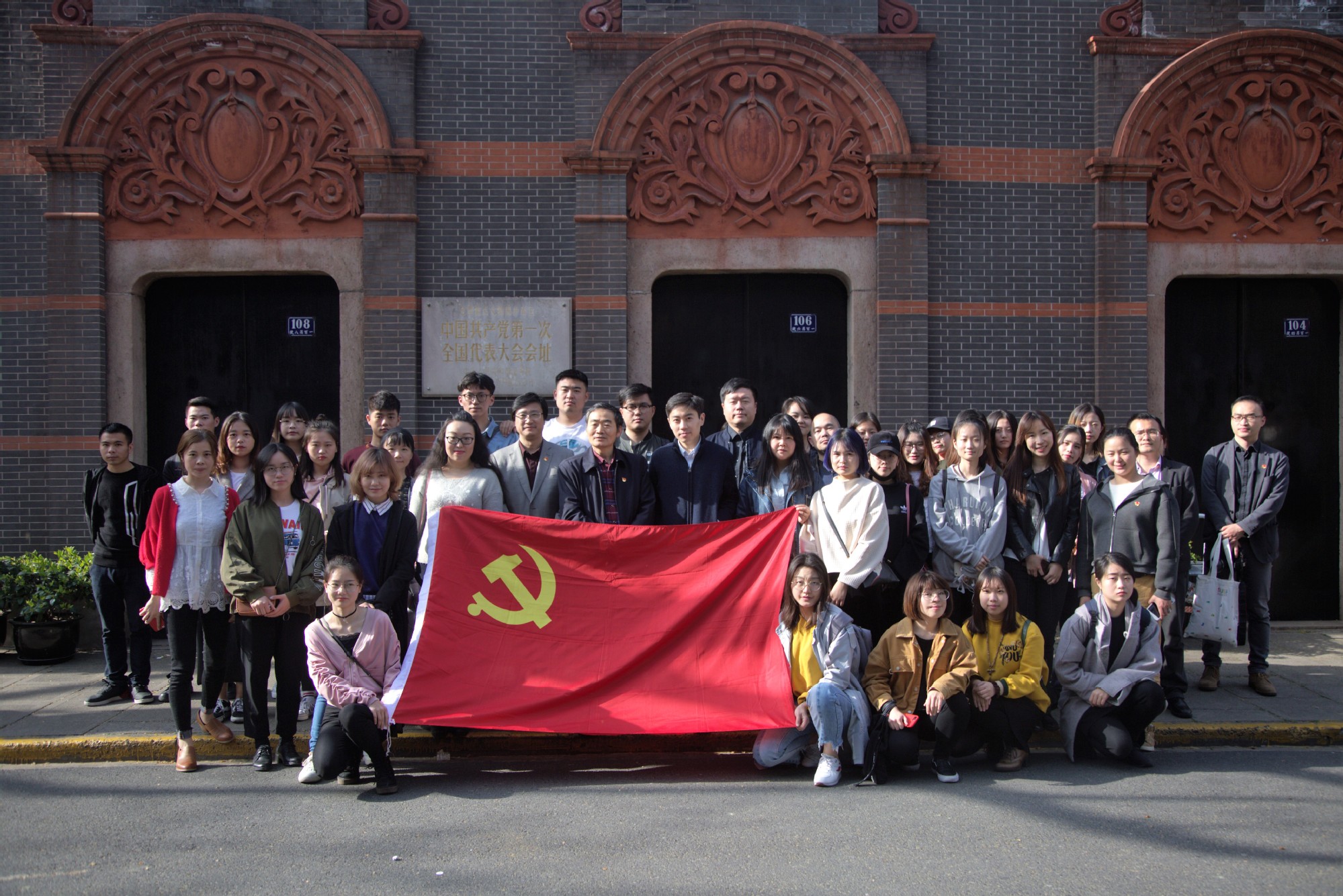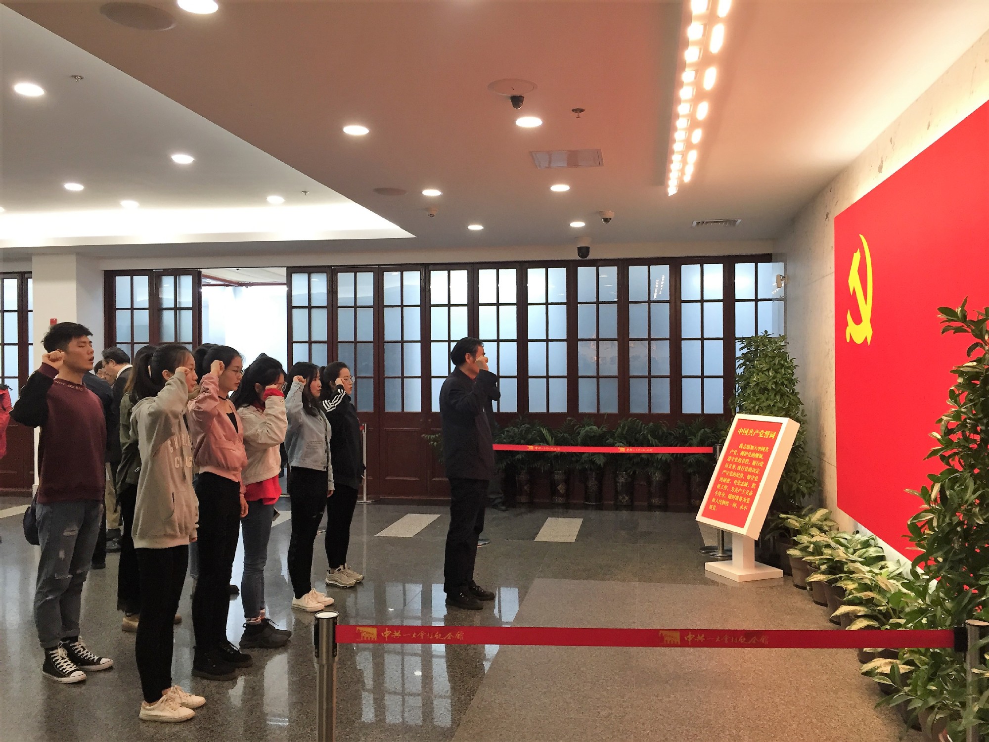 上海的中共一大会址是我们党梦想起航的地方,中国共产党从这里诞生,从这里出征,从这里走向全国执政。近百年来,中国共产党带领中国人民完成新民主主义革命,建立中华人民共和国,实现了中国从几千年封建专制政治向人民民主的伟大飞跃,完成社会主义革命,确立社会主义基本制度,推进社会主义建设,实现了中华民族走向繁荣富强的伟大飞跃。在中共一大代表群像浮雕前,艺术设计学院党总支师生党员认真端详这组青铜浮雕,仿佛又回到那个风雨飘摇的年代。参观之后,大家来到中共一大纪念馆宣誓厅,在党总支书记许传宏的领誓下,新党员举起右拳,面对党旗进行庄严宣誓。
