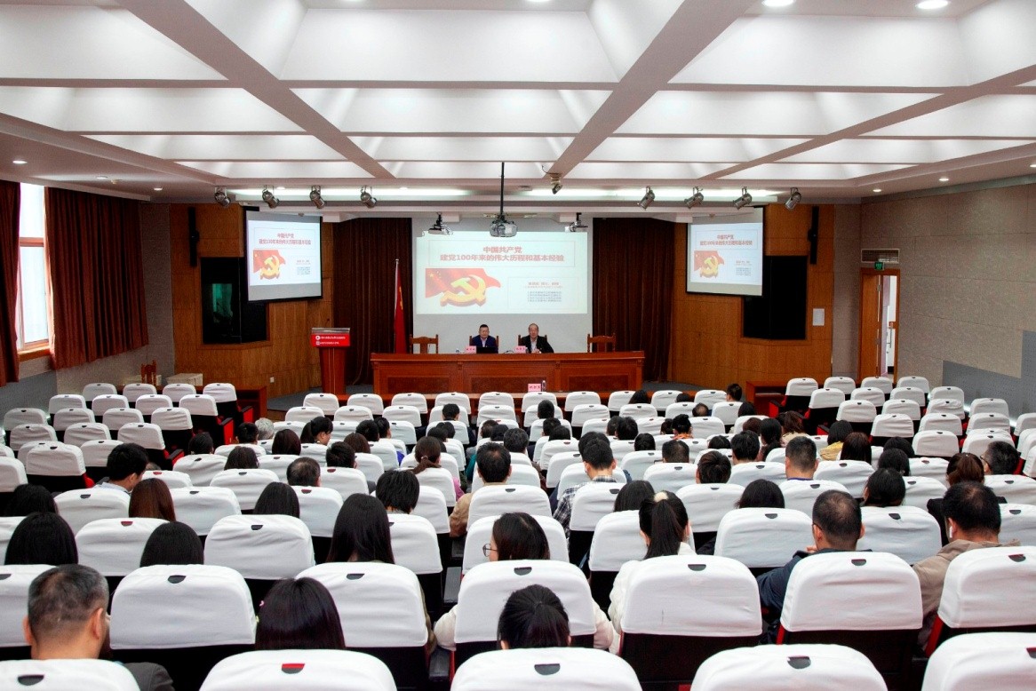 今年是中国共产党成立100周年,是“十四五”规划开局之年和开启全面建设社会主义现代化国家新征程的第一年。为学习贯彻习近平新时代中国特色社会主义思想和党的十九届五中全会精神,深入开展党史学习教育,4月21日下午,高职学院、高级技校在11楼思进厅举行党史学习教育党委中心组(扩大)学习会,特邀上海中医药大学马克思主义学院教授陈荣武作《中国共产党建党100年来的伟大历程和基本经验》党史学习专题辅导报告。院、校班子成员,全体中层干部,各党支部书记、支部委员,全体党员参加了党史学习报告会。会议由学院、校党委书记倪智勇主持。