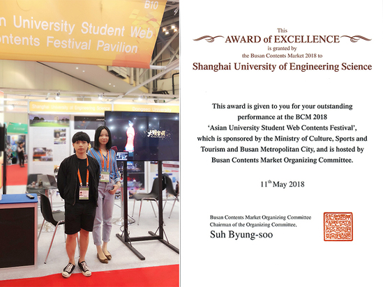 5月11日,中韩多媒体设计学院桂紫燕、李佳颖同学的《大明宫词》作品及周俊仁、潘奕同学的《CyberSpace》作品受邀在釜山国际影视节目展中展出,并参加亚洲大学生网络内容节获得最优大奖。