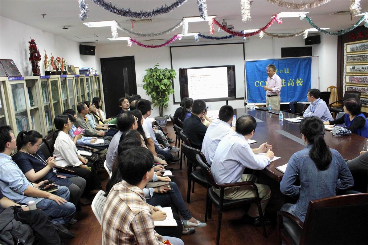 杨教授首先向老师们介绍了CCF中国计算机学会的基本情况。CCF历史悠久,一直以来是计算机科学与技术领域前沿的学术团体,传递、推广本领域最新研究成果,学会具有广泛的业务范围,包括学术交流、科学普及、技术咨询、教育评估、优秀成果及人物评奖、刊物出版、计算机名词标准化等。杨教授欢迎、鼓励相关专业教师积极参加,加入到这个研讨学术问题的大平台里来。