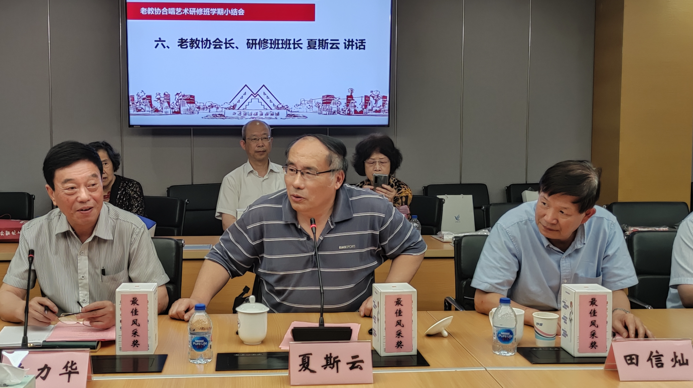 校老教协会长、合唱艺术研修班班长夏斯云希望,老教授协会要提高政治站位、文化品位和服务档次,他感谢离退休党工委对老教协的大力支持,希望这个团队越来越好,做到“不忘初心、继续前进”。
