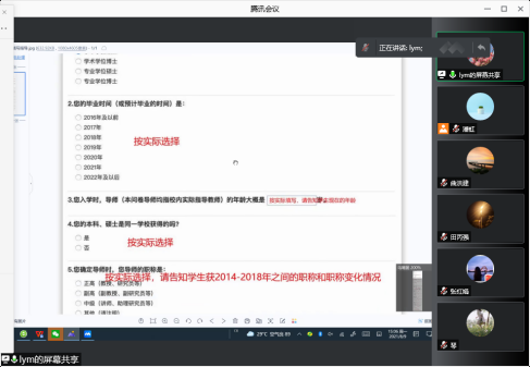 李艳梅副院长介绍了学科评估问卷调查发放现状,强调必须加以重视,过程中必须通知到每位学生,针对2016-2021届毕业生,确保每位被调查对象的手机和邮箱的准确性,请学生随时关注手机和邮箱,确保收到调查问卷后及时填写。在后续的单位调查中要保证联系人信息的准确性,请单位随时关注国家学位中心发出的关于第五轮学科评估的调查问卷并及时支持完成调查问卷。会上,李艳梅副院长还强调了导师指导学生的规范要求,并提出了后续学生参加国内外学术会议的鼓励措施等。