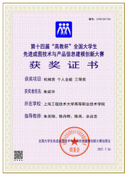 据悉,本次大赛于采用开放式题目——产品轻量化设计与3D打印,通过线上方式展开竞赛,进行尺规绘图、立体构型、制图基础知识和计算机建模多个环节的答题。高职学院制图教研室陈燕老师、朱项翔老师和余启志老师全程进行指导和培训,选手们秉着为校争光的使命,积极投入比赛,最终取了佳绩。
