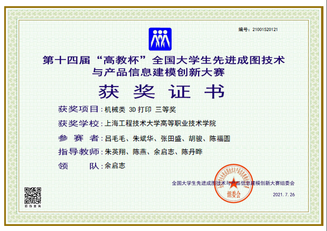 近日,高职学院9名学子代表学校参加了全国大学生先进成图技术与产品信息建模创新大赛,吕毛毛、朱斌华、张田盛、胡骏、陈福圆同学获得机械类3D打印团体三等奖,朱斌华同学获得个人全能三等奖。本次大赛由教育部高等学校工程图学课程教学指导委员会、中国图学学会制图技术专业委员会和中国图学学会产品信息建模专业委员会联合主办的图学类课程最高级别的国家级赛事,来自全国551所高校的6743名选手参加了本次比赛。