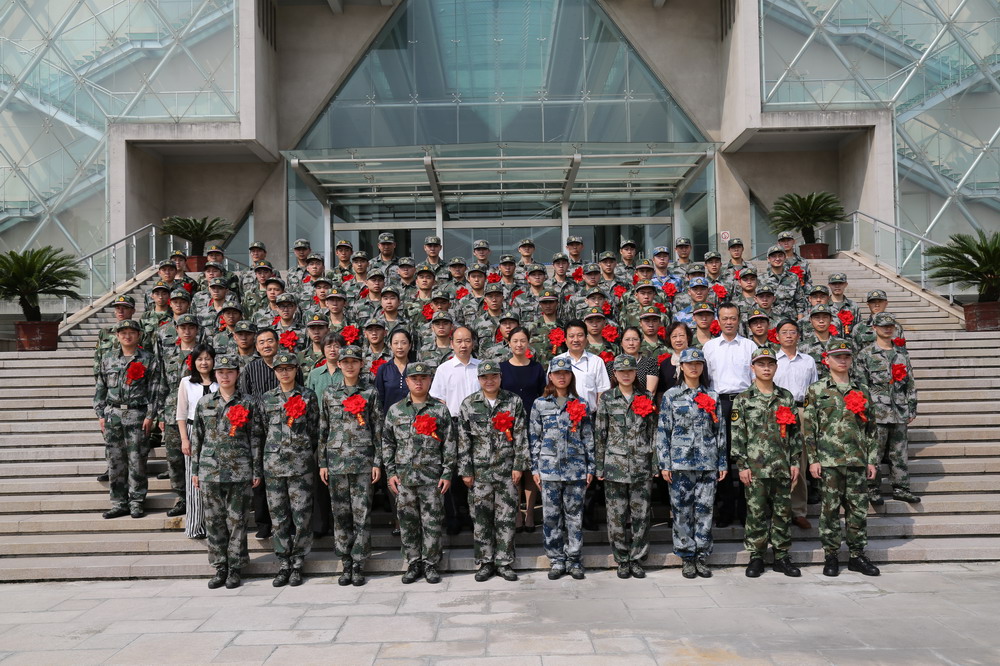 会后,校领导、学院领导与今年应征入伍学生在大台阶合影留念。